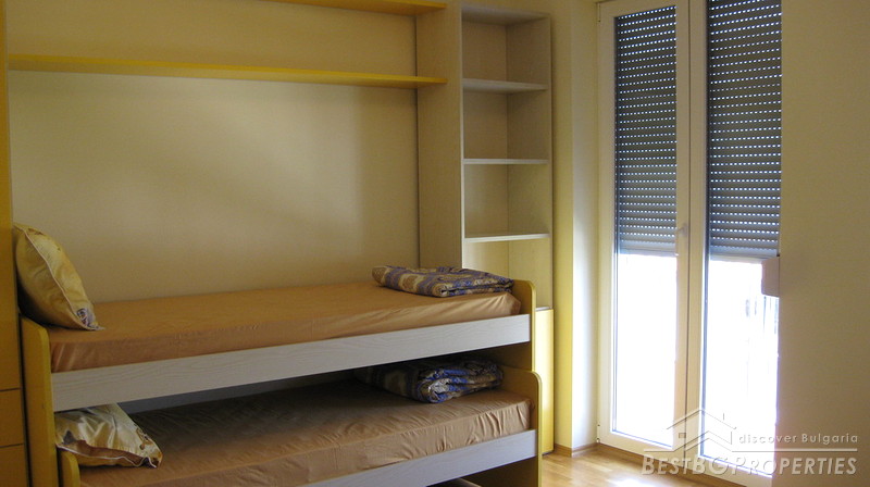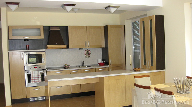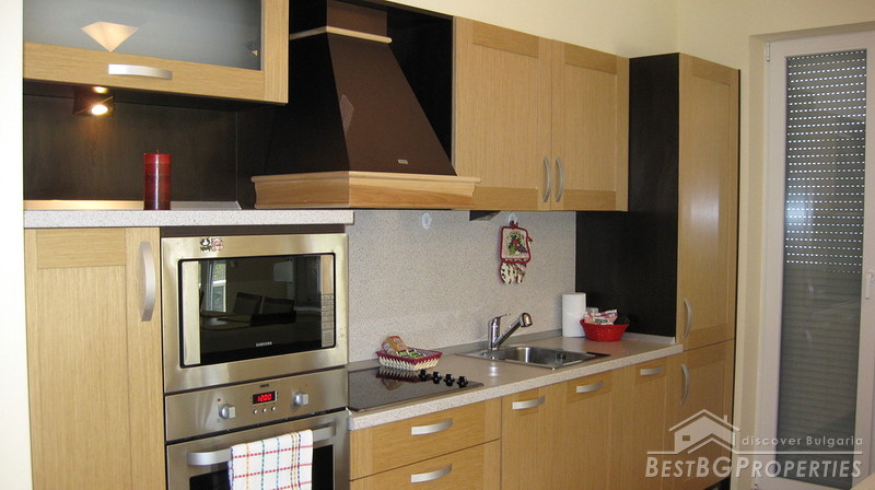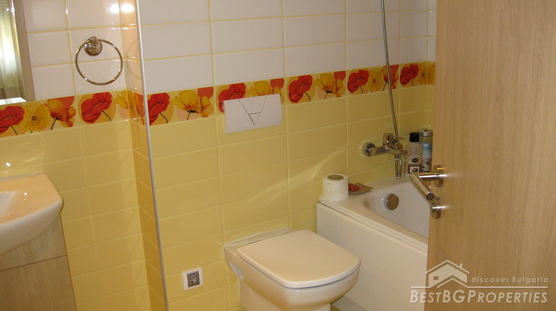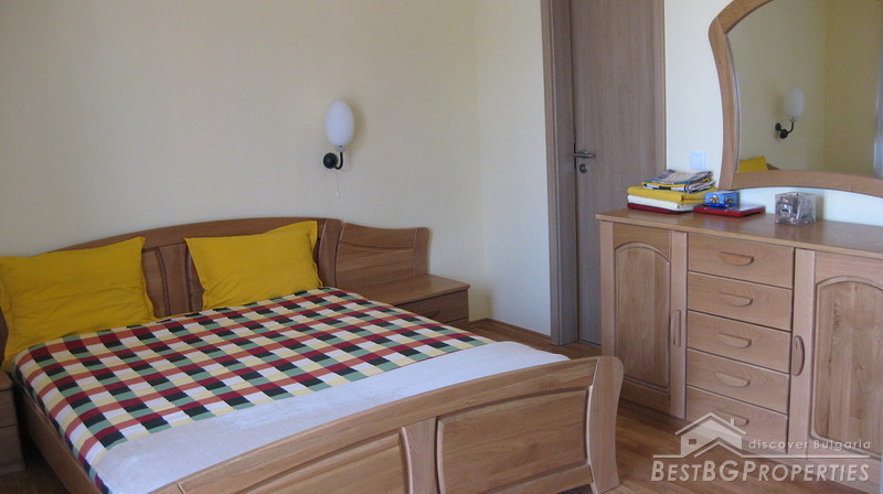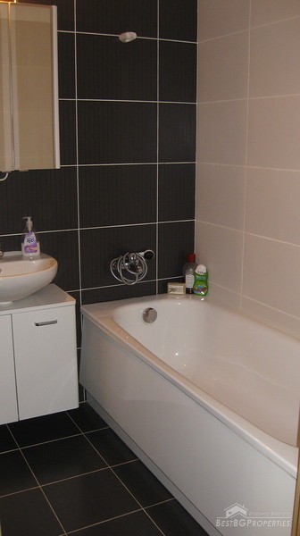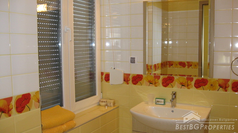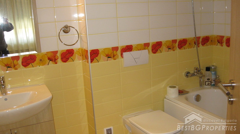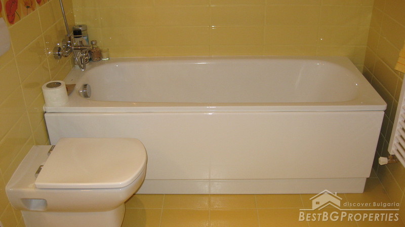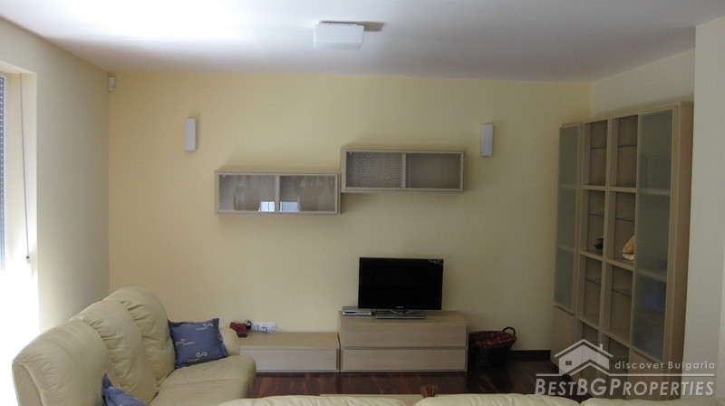 The apartment is a two bedroom type and consists of large living room with kitchen box, and two bedrooms. One of the bedrooms has its own separate bathroom with bath tub. The corridor for the bedrooms leads to the second bathroom which is equipped with shower cabin. There is one balcony with nice view. The price for this apartment also includes an underground parking. The heating is due mounted radiators and also two air conditioners. The total living area of the apartment is 130 sq m and it is set on the second floor of the building. The apartment is completely furnished and ready to move in. The complex has 24 hours security and video surveillance.