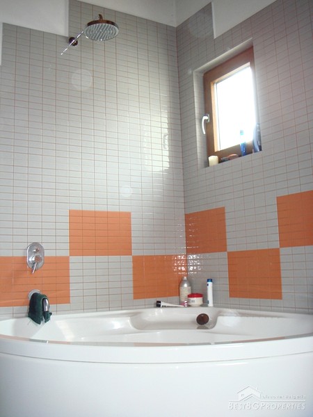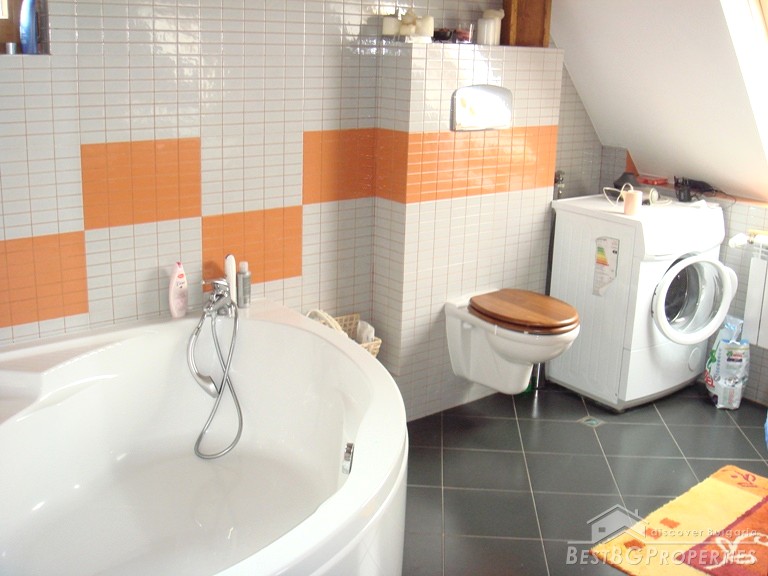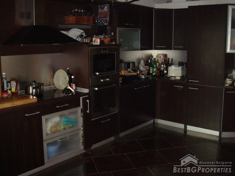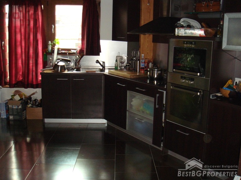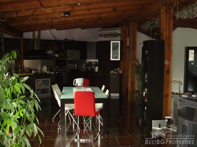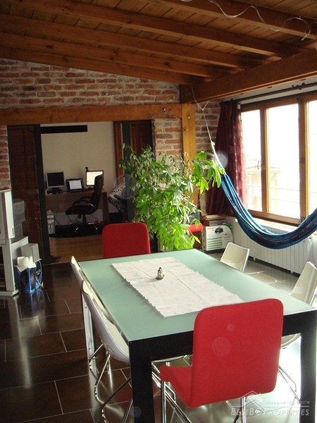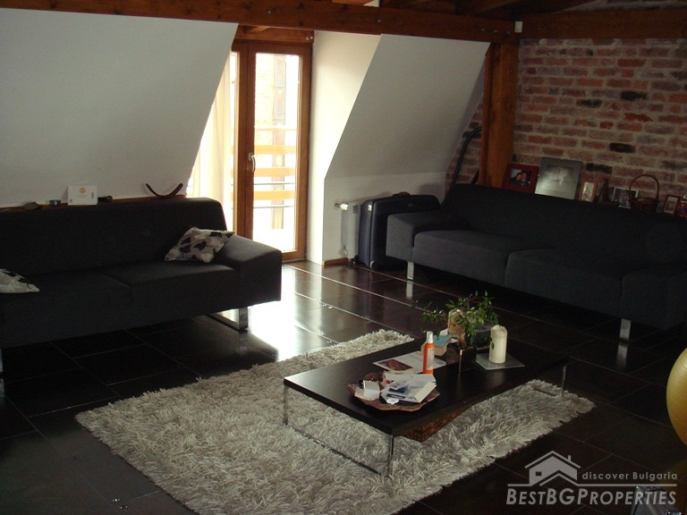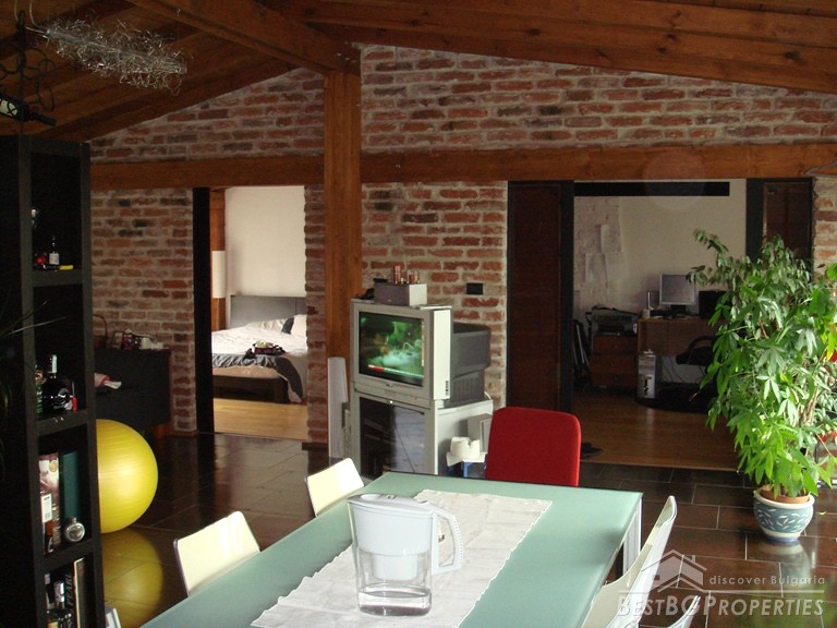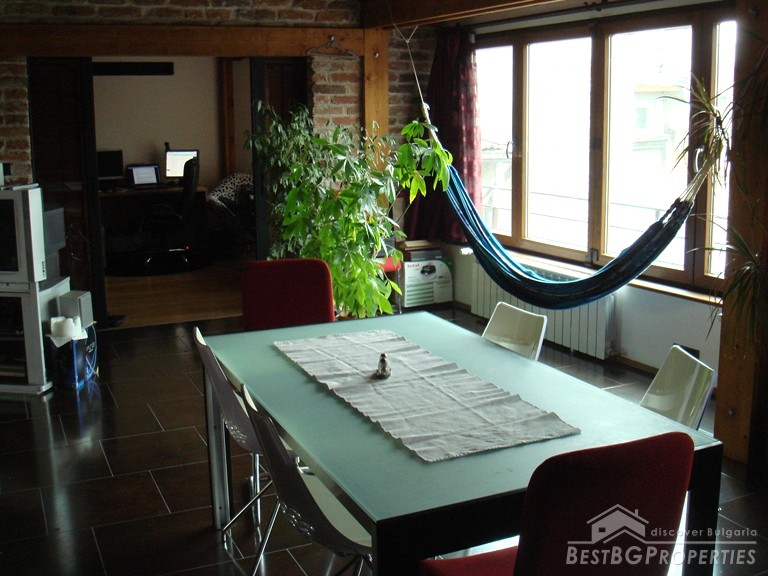 The apartment is located on the top floor. The total area is 120 sq m. It consists of a living room, sitting area, dining room, kitchen, bathroom with bath tub and WC, 2 bedrooms, separate WC, and a balcony. The doors to the bedrooms are sliding and soundproof. The apartment has central heating. For your convenience in the hot summer days there is air conditioning. The apartment is equipped with everything necessary, quality electrical appliances, convenient sanitary. It has a preserved design in the spirit of the Balkan style: wood and natural stone. The floorings in the bedrooms are from oak wooden, and in the living room and kitchen is tile.