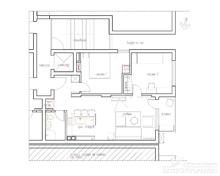 The property can be sold with a garage on the ground level of the building - 31.66 sq m. The garage benefits with a high ceiling and there is ae possibility of mounting a mechanism for 2 cars parking vertically.