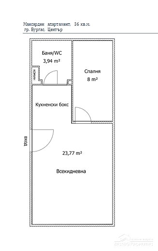 Bright and cozy mansard apartment for sale in the center of Burgas. The apartment consists of a spacious living room with a kitchen box, one bedroom and a bathroom with a toilet.