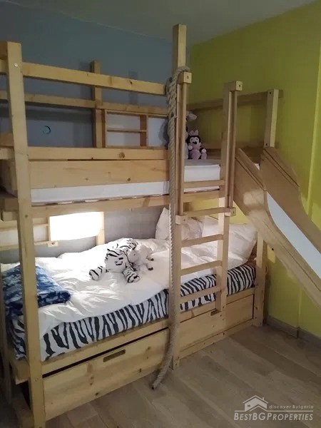 The apartment consists of a kitchen, children’s room / bedroom, bathroom, living room, transitional bedroom, a terrace and a corridor.