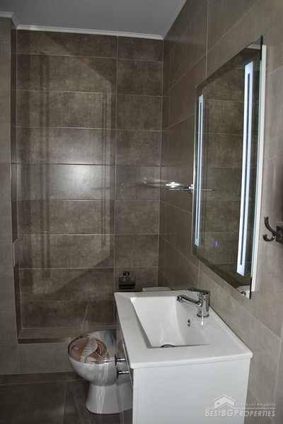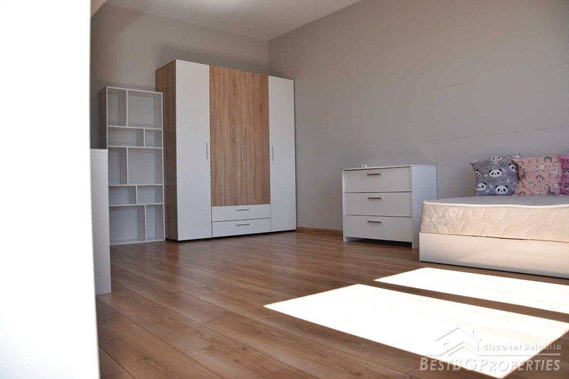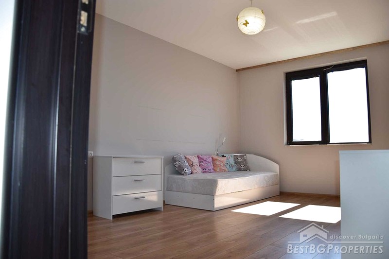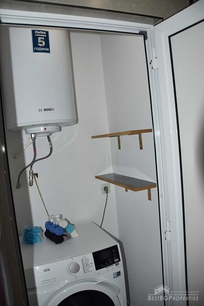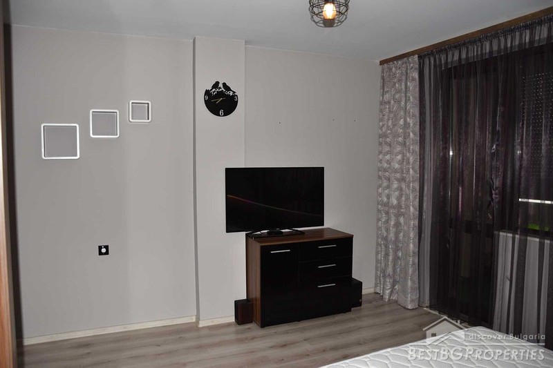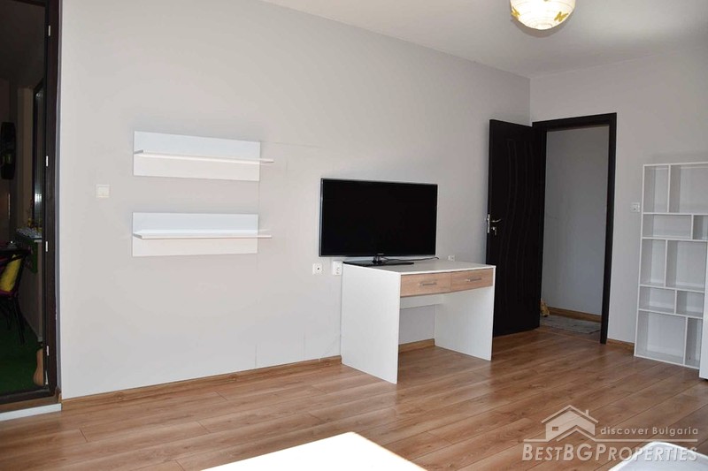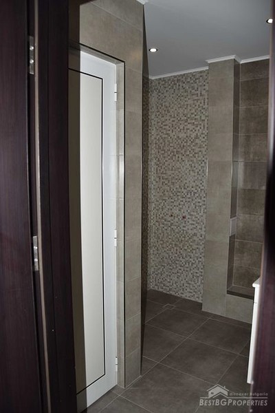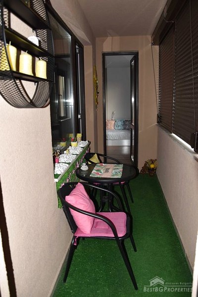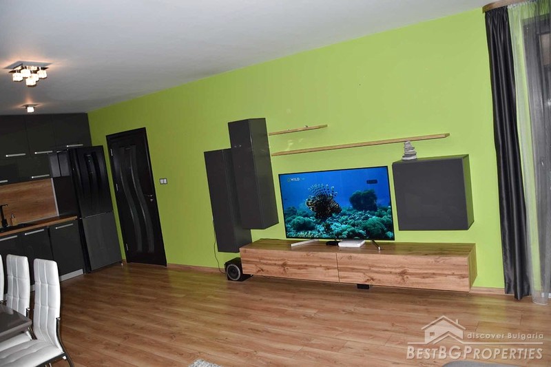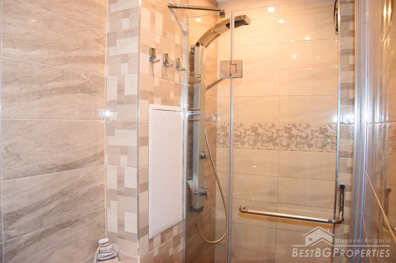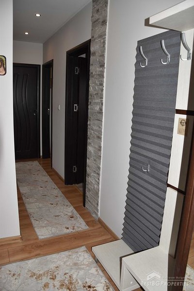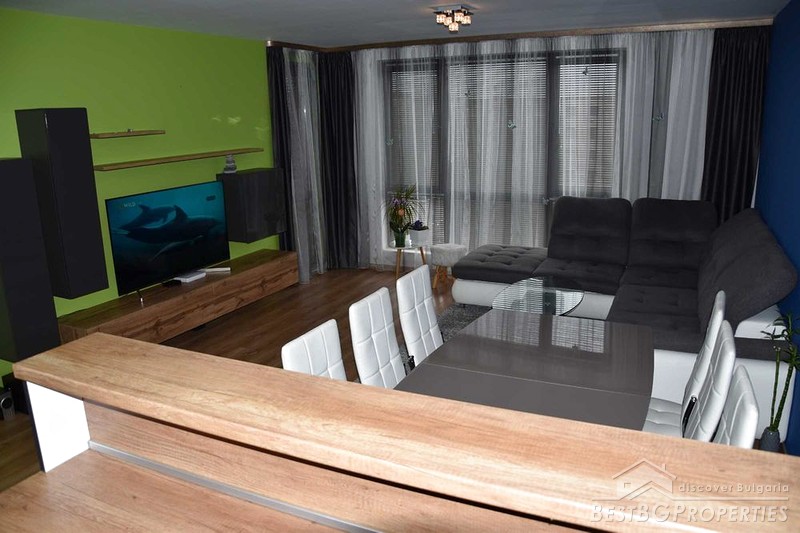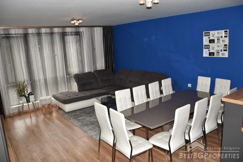 The apartment has a total living area of 118 sq m. It consists of a large spacious living room with kitchenette - 34 sq m, two large bedrooms, two bathrooms with toilets and laundry room, entrance hall, terrace with brand new aluminum blinds, with access from all three rooms. The property offers a beautiful view of the Rhodopes, as well as the inside yard of the complex.