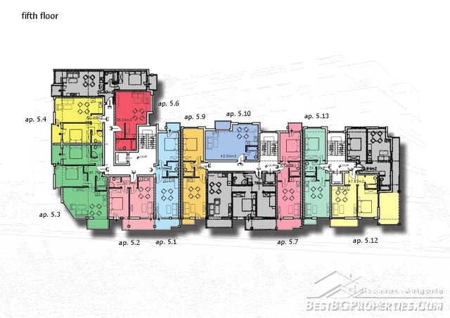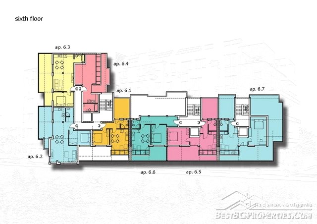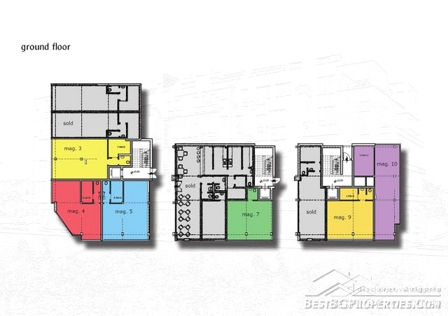 SECTION B- Basement consists of entrance-hall, stair hall, one elevator, restaurant and two shops with WC. The three residential floors include 2 studios and 3 one-bedroom apartments. The 5th floor consists of 2 one-bedroom, 1 two-bedroom apartments. The mansard floor consists of 2 apartments with large terraces.