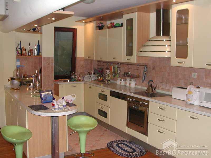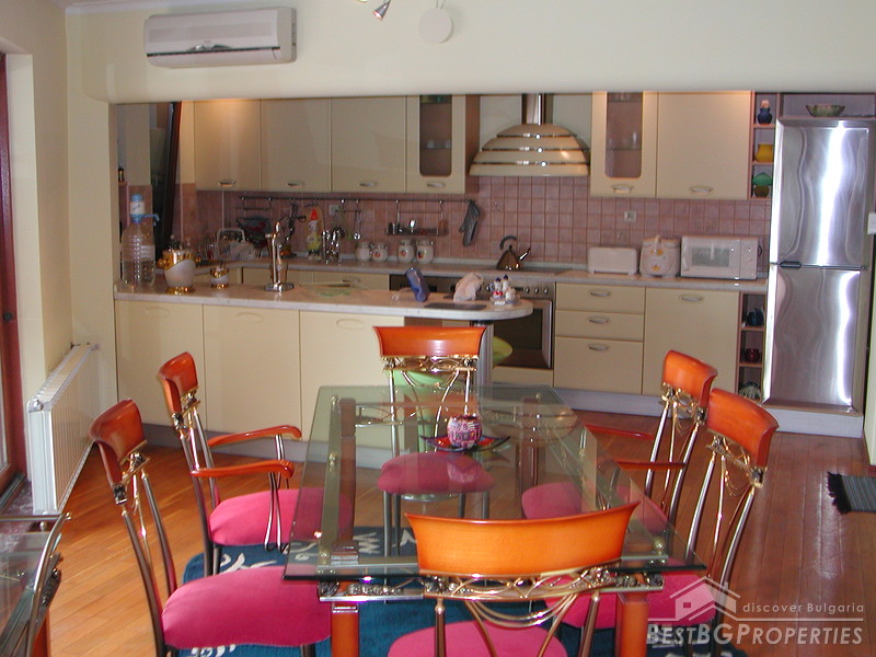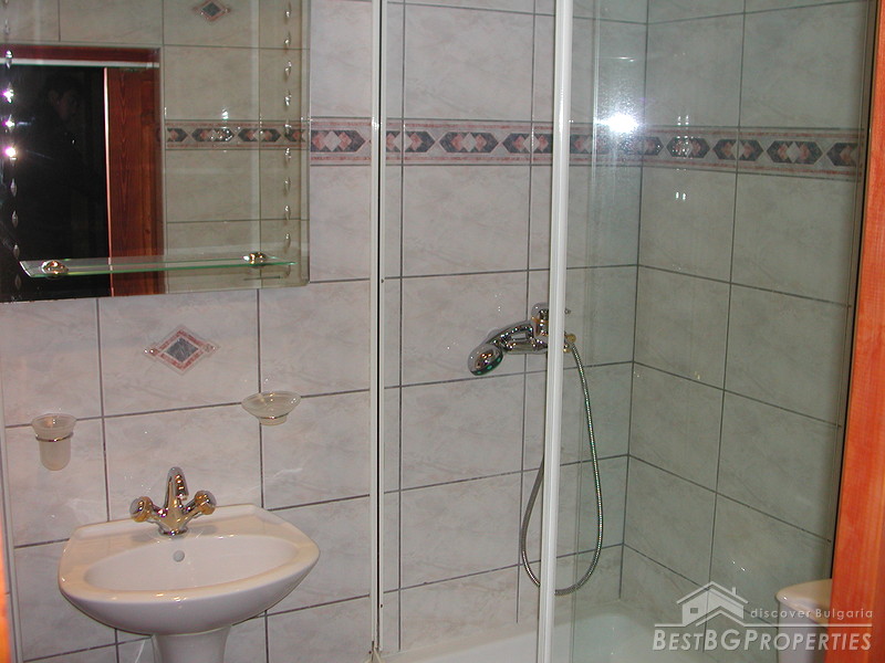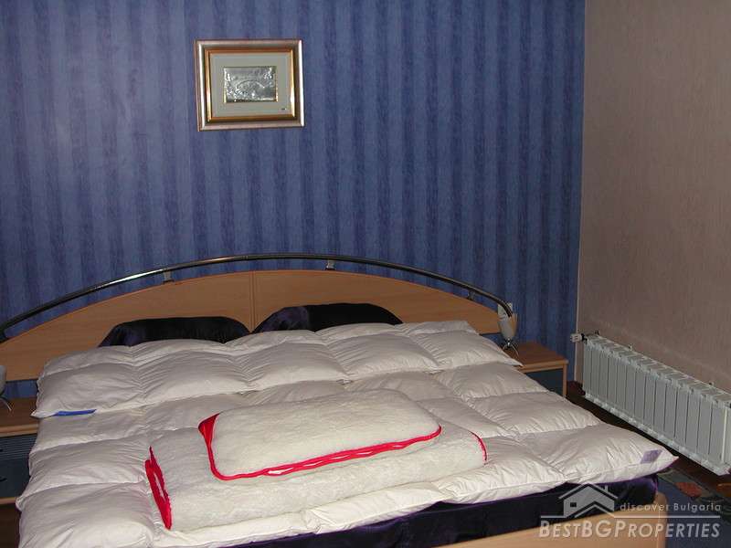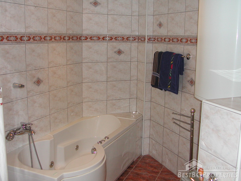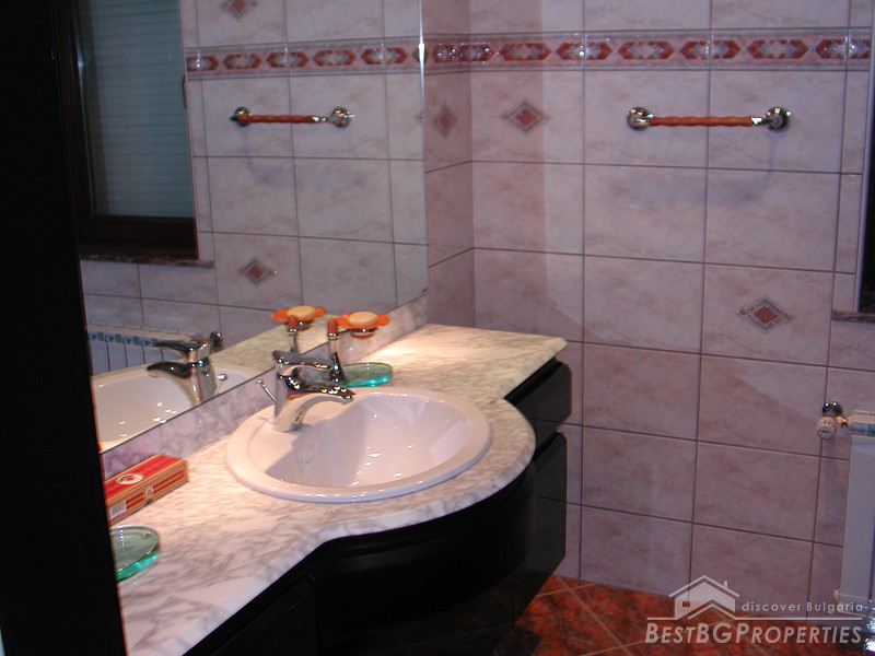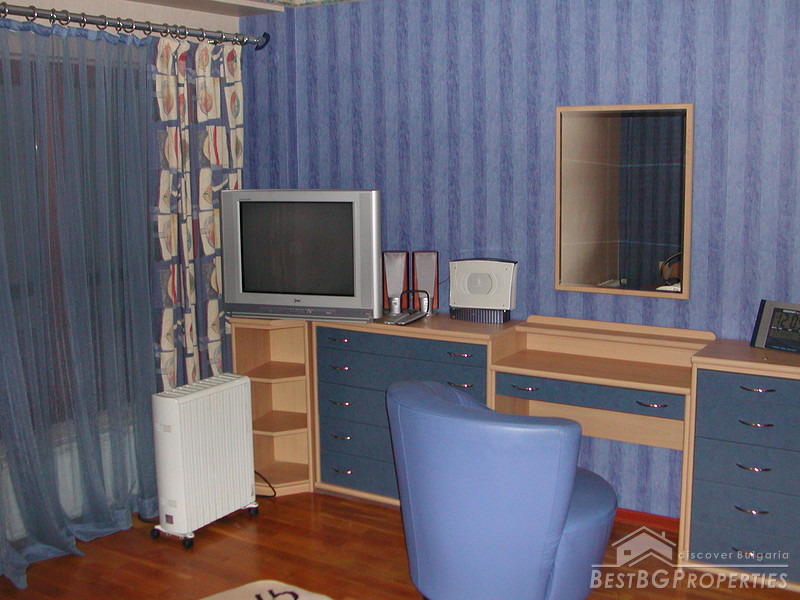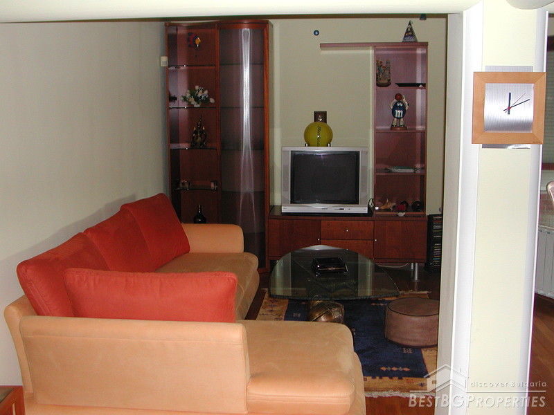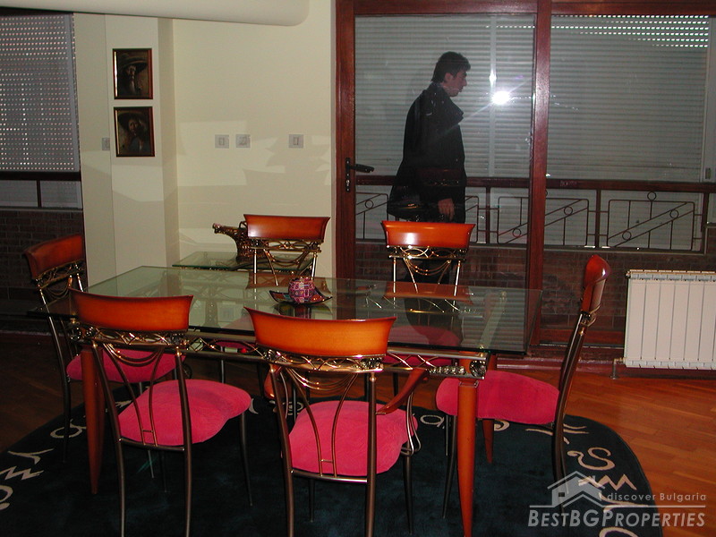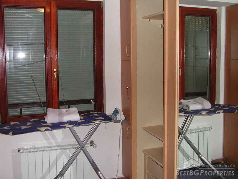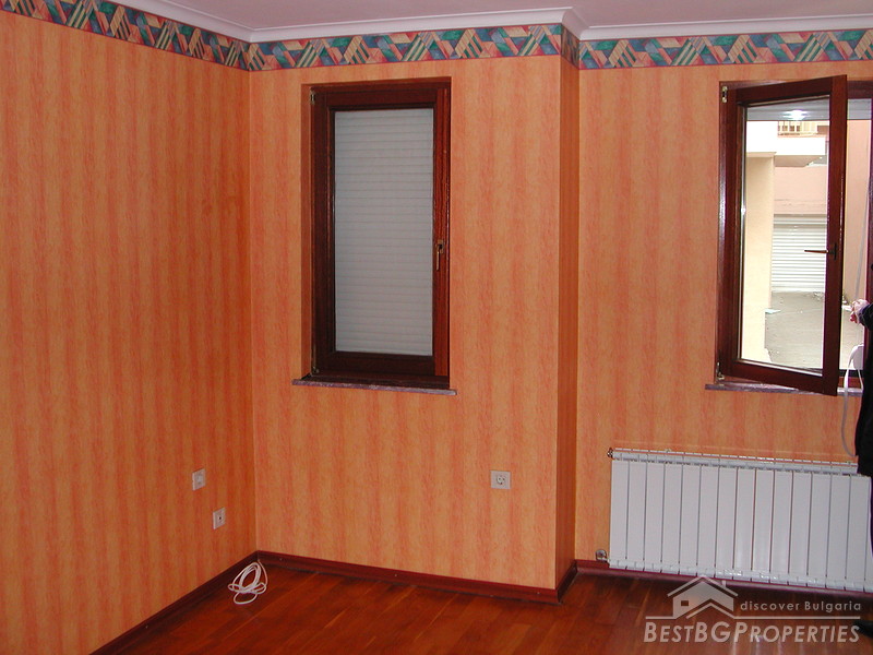 The apartment is finished with best quality materials and meets the highest standards of construction. It is made entirely of brick. On the outside the walls are with thermal isolation and mineral plastering. From the inside the walls are painted with high quality latex. The floorings in the rooms are with laminate. The floor in the kitchen box is from terracotta. The bathrooms are finished with terracotta and faience. The window joinery is PVC. The inner doors are MDF. The apartment is central heated and there is a radiator in each room. The living room is also air conditioned. Water and electricity is provided. Electricity installation with all switches, sockets and lighting objects.