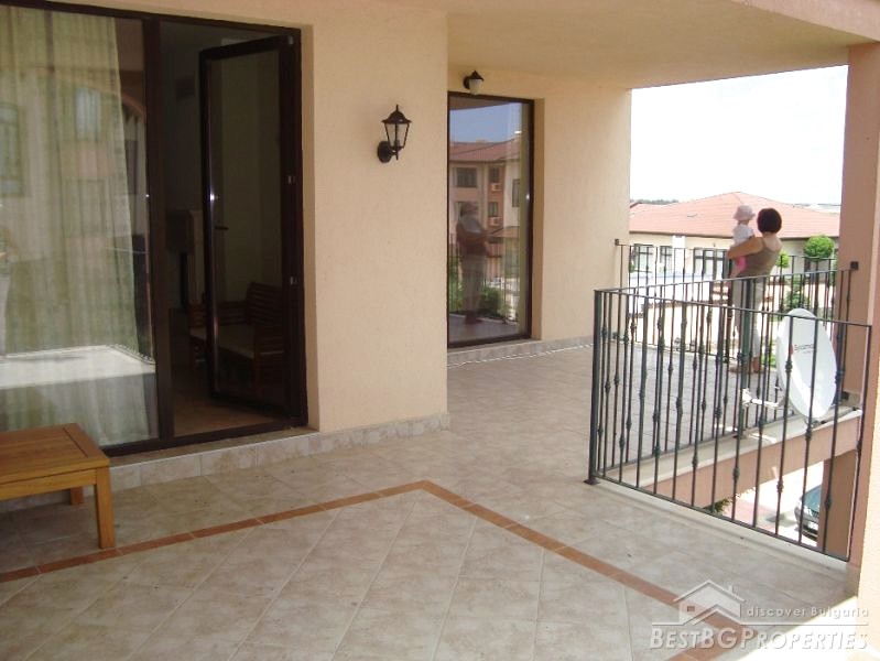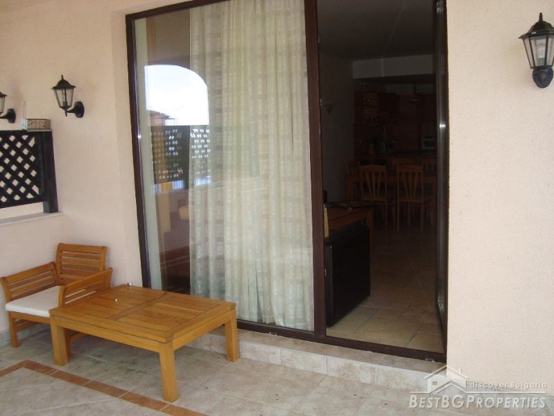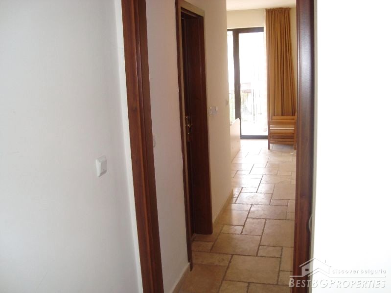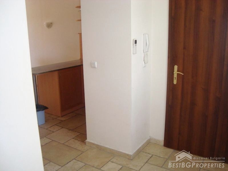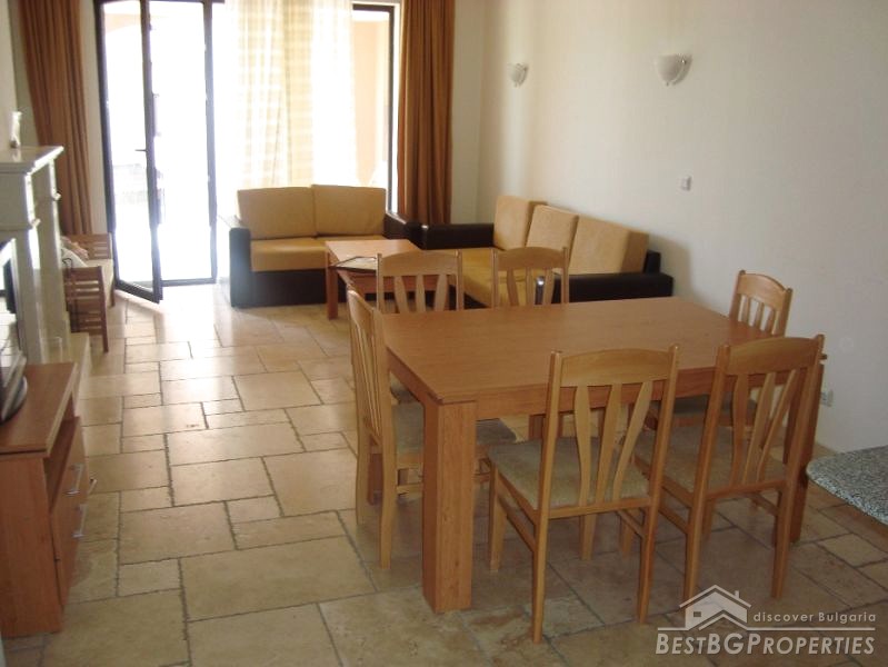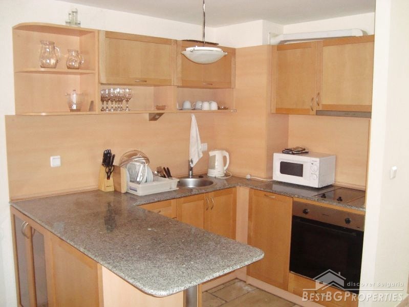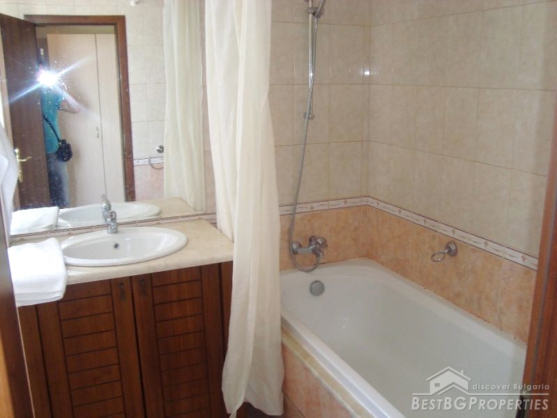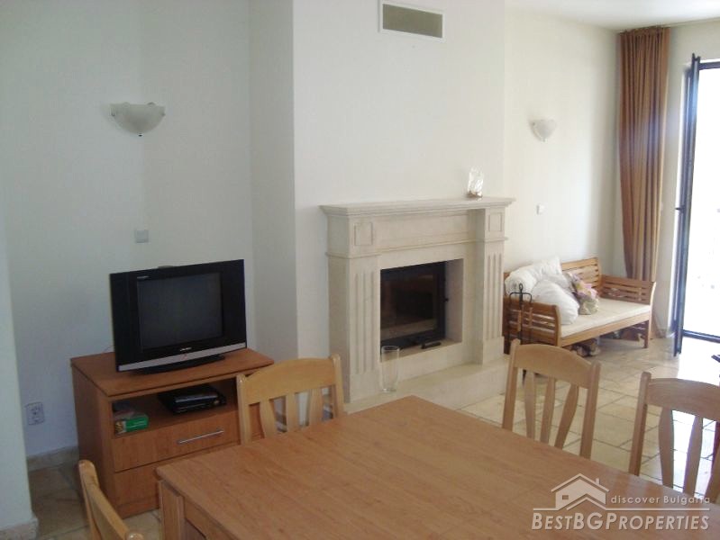 The apartment is on the second floor, fully furnished. It is equipped with marble fireplace, individual air-conditioning system for cooling / heating, electric hot water boiler. The kitchen is fully fitted with lower and upper cabinets. It has a built-in refrigerator, extractor hood, ceramic hob, steel sink. The doors and windows are double-glazed with PVC German profiles