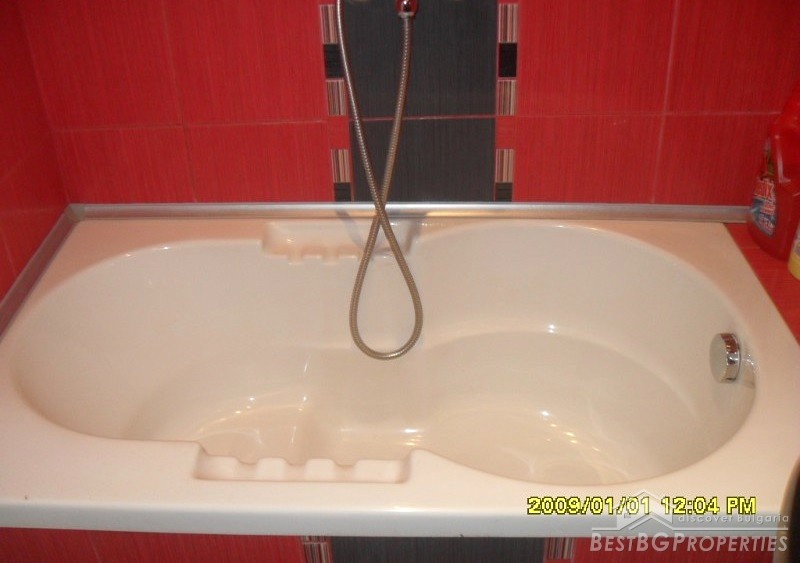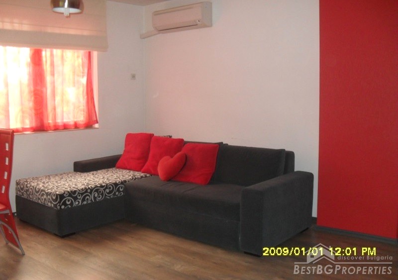 The total living area is 65 sq m. The apartment is one-bedroom type. It consists of a living room with kitchen box, one bedroom, lounge and a bathroom with WC. The finishing is turnkey. The floors have laminate and terracotta floors. There are two air conditioners. The bathroom is equipped with bathtub. There is all furniture and electrical appliances.