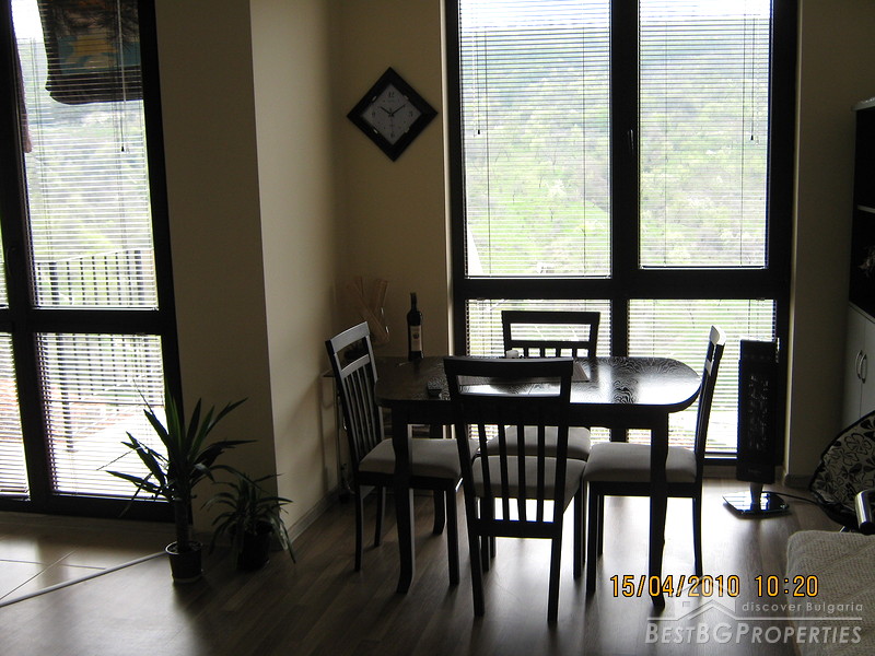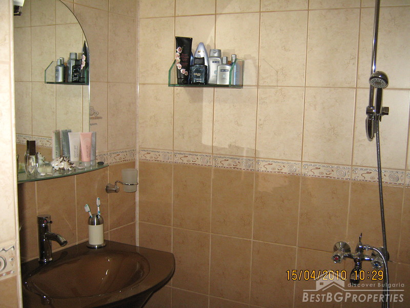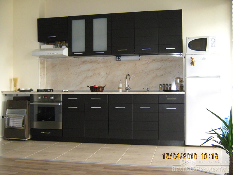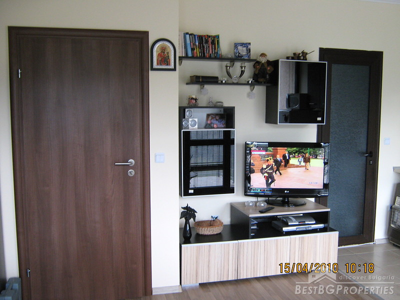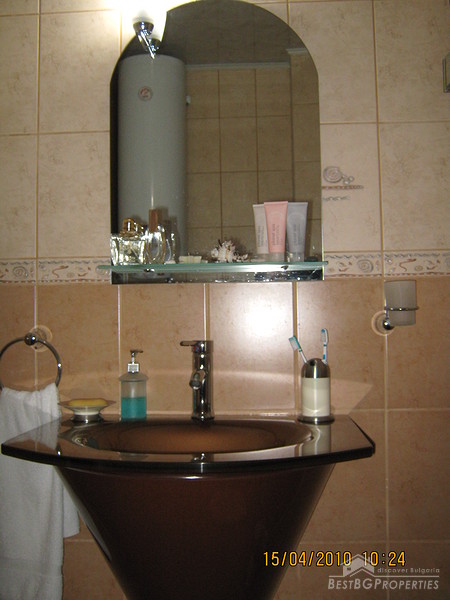 The apartment is luxuriously finished and furnished. The finishing includes laminate and terracotta floorings, latex painted walls and ceilings, and mounted switches and sockets. There is fully fitted and equipped kitchen and also all other furniture.