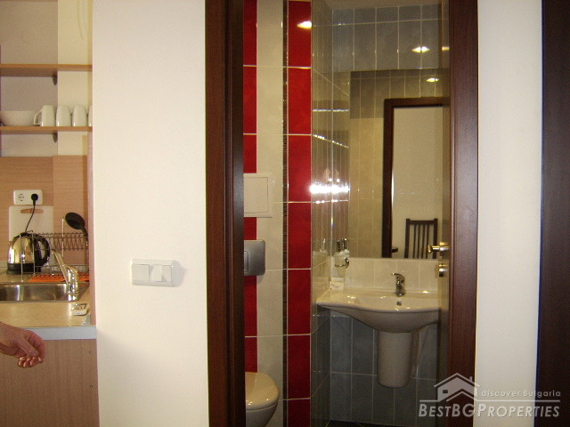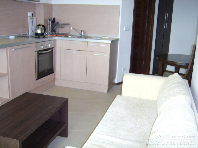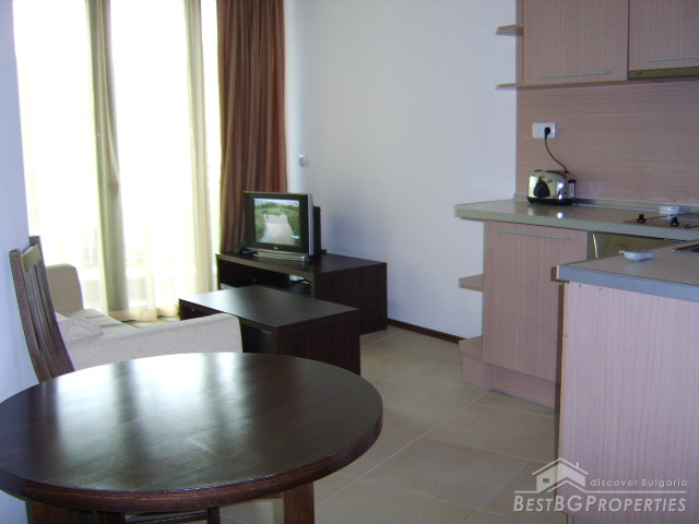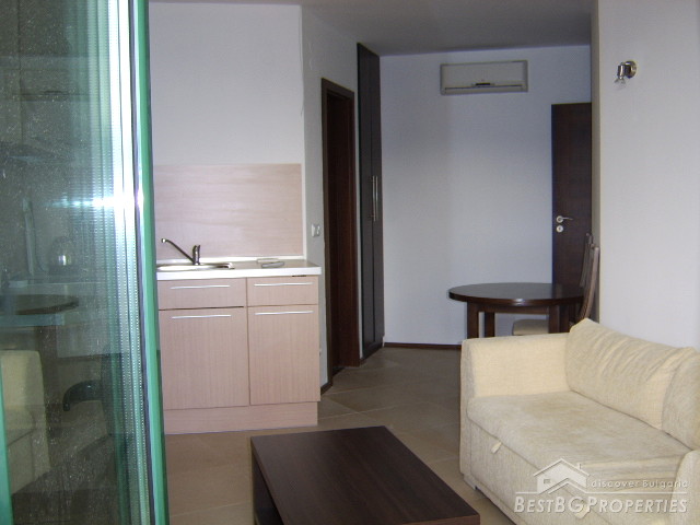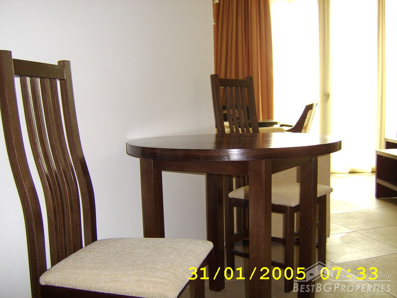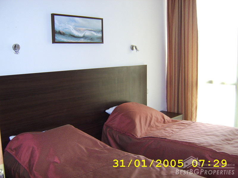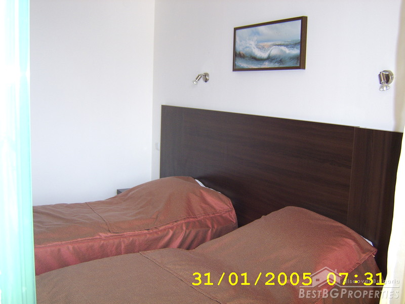 It is a very spacious 1-bedroom apartment with total living area of 86 sq m and clean living space of 61.25 sq m. It is offered for sale fully furnished and equipped with everything necessary. The apartment consists of one-bedroom, hallway, bathroom and a living room with kitchen. The balcony which services both bedroom and living area has magnificent views towards the sea towards Albena, and the white hills of Balchik.