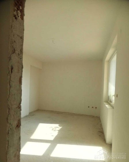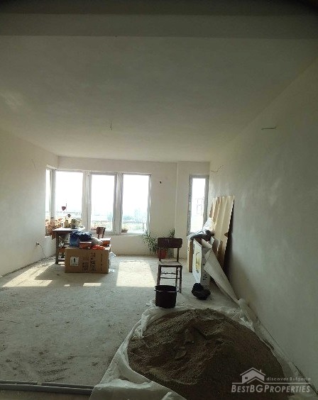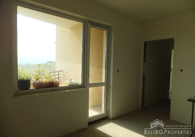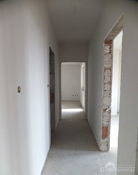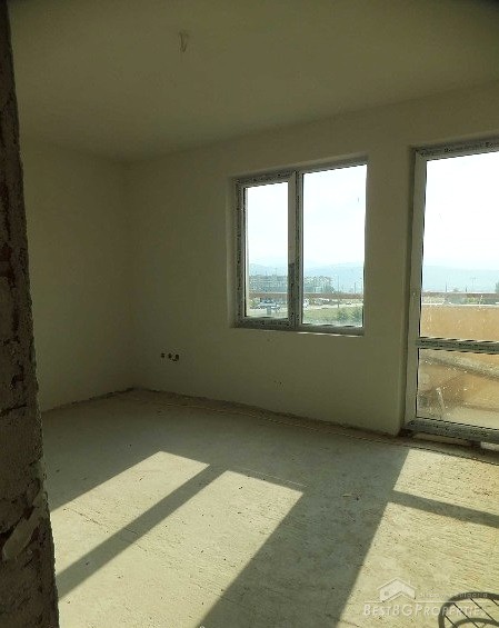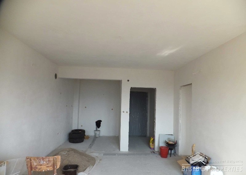The stage of completion is according the Bulgarian standard: walls – plaster; PVC window joineries; electrical installations; plumbing; front door. The apartment has south-west exposure. It is extremely sunny and light.