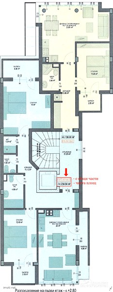 It is a very sunny apartment with exposure on three sides. The apartment is situated on the first floor of the six floored residential building. It comprises total living area of 116 sq m and consists of a living room with kitchenette and dining area, two bedrooms, bathroom and toilet, second toilet and a laundry premise. It is on the first residential floor - above a garage. In addition to the apartment there is an ownership of the land, and a basement - 4.77 square meters in size.