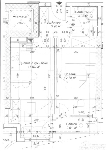 The apartment is located on the 3rd floor and has a total living area of 55.96 sq m. The clean living space is 47.42 sq m. The apartment consists of a living room with kitchenette, a bedroom with a balcony and a corridor with a bathroom with WC. The windows overlook the courtyard of the building (southeast).