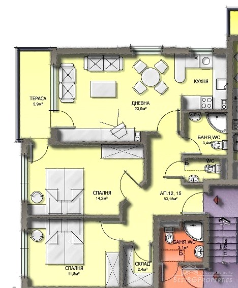 The apartment has total living area of 91 sq m and consists of a living room with kitchen, two bedrooms, bathroom, toilet and a balcony. The exposure is to the south-southeast. The price includes full furniture pack which is almost as brand new – only used for 4-5 months.