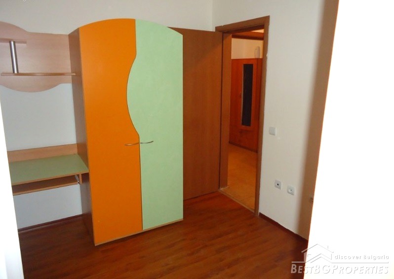The apartment is part of a new residential building finished in 2009. The building has one entrance, ground floor with garages and four residential floors. The apartment is situated in the ground floor and consists of a lounge, living room with kitchen box, one bedroom and a terrace. The property is offered completely furnished. There are all communications including wireless "Bulsatcom" TV and Internet.
