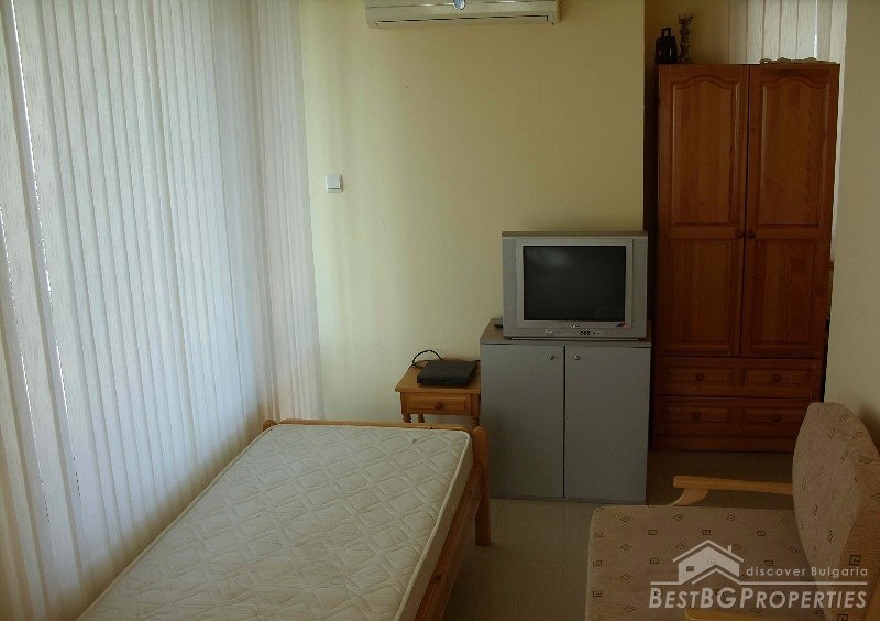 It is a studio apartment for sale with total living area of 35 sq m. It consists of one room - living room with kitchen, bathroom with WC and also a balcony with nice views. The apartment is sold with all furniture and equipment - ready to move in. The entrance to the building is secured with lock.