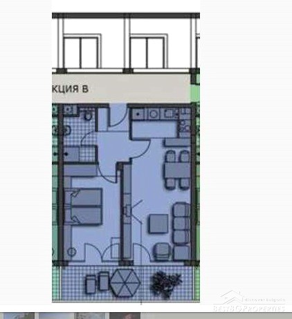 The apartment is on the sixth floor out of nine. The price includes full furniture and equipment. The property has total living area of 70 sq m. The area is distributed between a large living room with kitchen, bathroom with WC and a bedroom. There is also a large terrace with amazing views of the sea.
