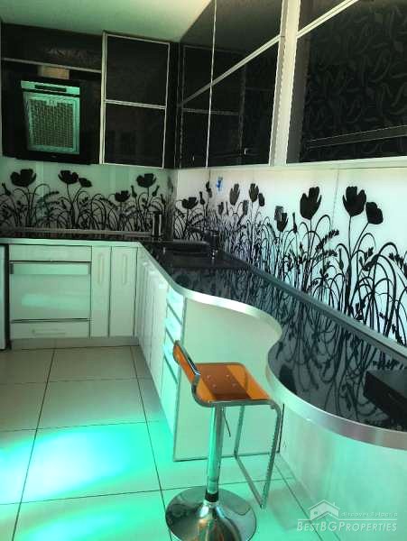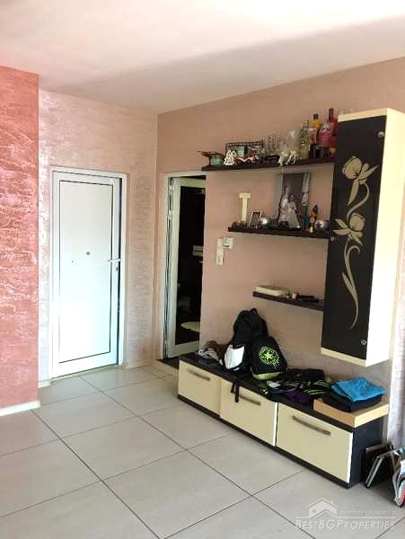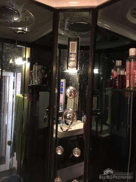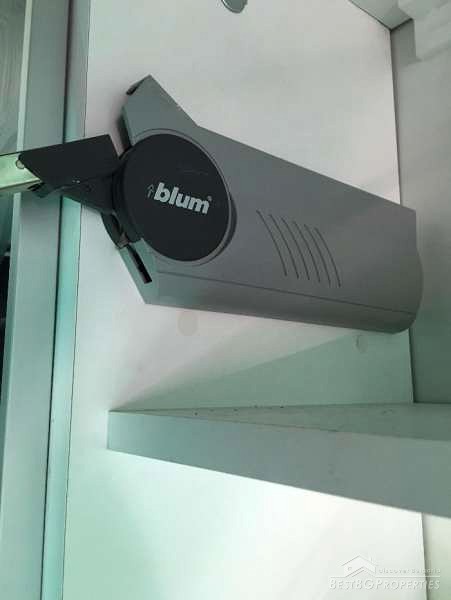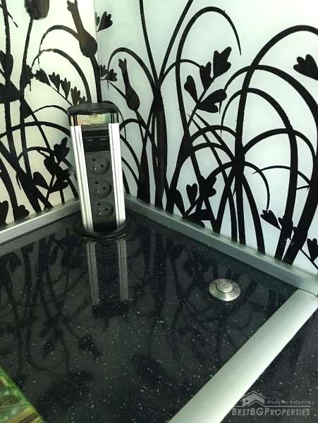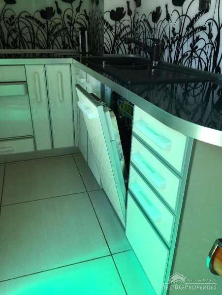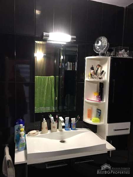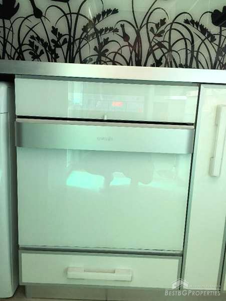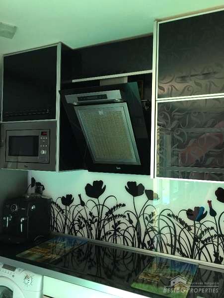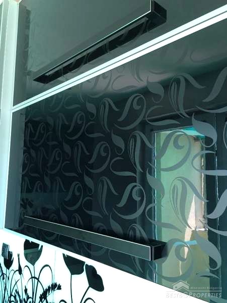 The apartment consists of one bedroom, living room, separate kitchen, bathroom and a terrace. It is facing south / north. The finishing is turnkey - Italian granite, Venetian decorative plaster, PVC windows with UV protection, underfloor heating. There is a modern kitchen with integrated appliances TEKA -inductive sensor hob, extractor, microwave, oven with touch controls, etc. The apartment benefits with luxurious bathroom with underfloor and wall heating, shower cabin. There is 24-hour video surveillance and alarm with volume sensors.