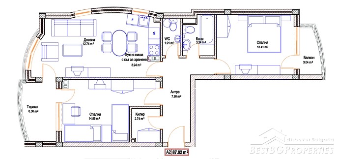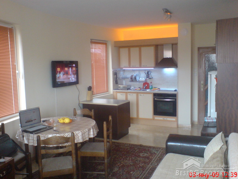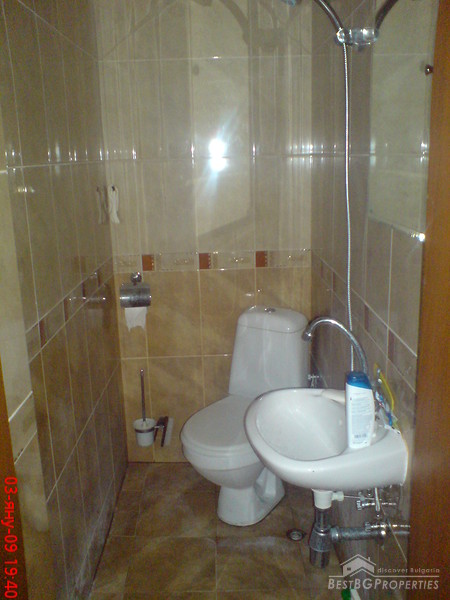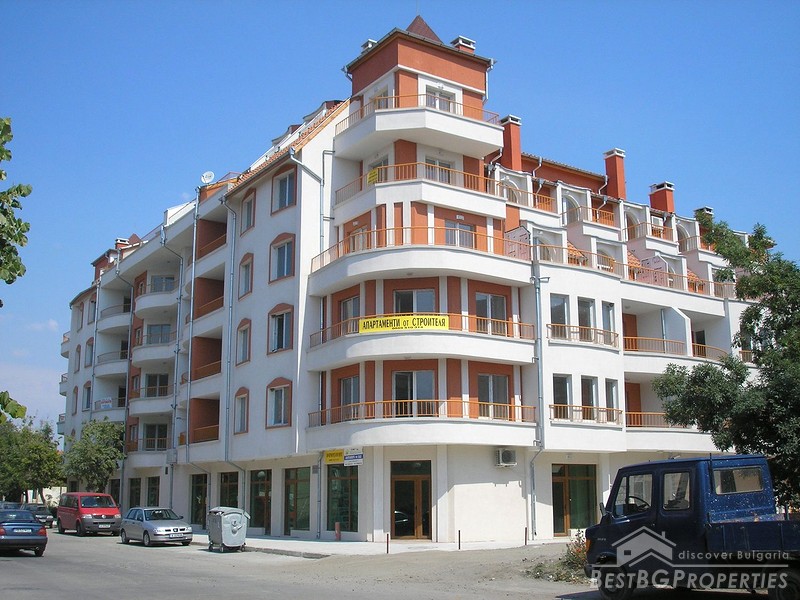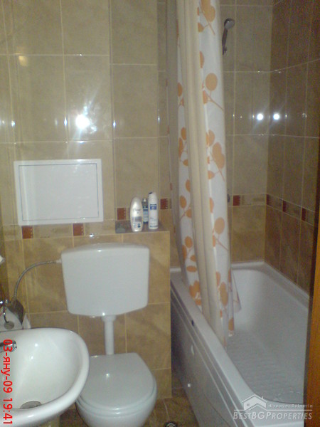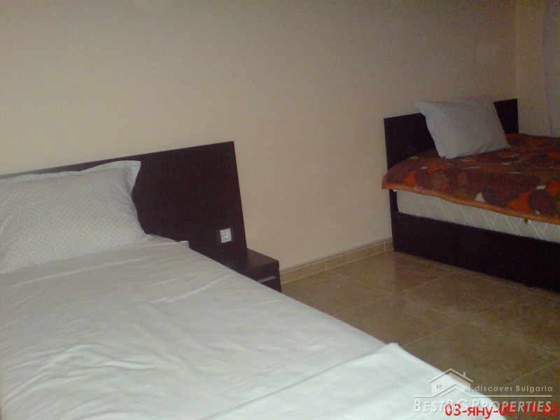This is outstanding apartment for sale in a new building located in the town of Pomorie just few meters from the sea. The apartment is situated in the old part of the town. The building is built in 2007, it is fully finished. It has act 16. The apartment is located on the 1st floor of the building and is 97 sq m in size. The apartment is facing south - east and has an awesome view towards the sea and a lake. It consists of a living room with kitchen box 21 sq m in size, two bedrooms 13 and 14 sq m, two balconies 3 and 6 sq m in size, bathroom 3,34 sq, WC 1,91 sq m in size, also corridor and a closet. There is also a garage which is 24 sq m in size. The apartment is finished with high quality materials by the highest standards. There is terracotta flooring in the bedrooms, faience and terracotta on the floor and walls in the bathroom and the WC. The walls and ceilings are painted with white latex. Electricity system, all plugs, switches and lighting objects are installed. The window frames are PVC. The bathroom is equipped with a bath tub, sink and cupboards. The WC with sanitary equipment, sink and shower. The apartment is fully furnished. There is one big double bed in the first bedroom, wardrobe, night stands. In the second bedroom there are 2 smaller beds, wardrobe and night stands. The living room comprises of one round wooden table with chairs. Sofa, TV set. The kitchen is fully equipped, there is an oven, absorber, fridge, sink, cup boards, dishes and other. This is the perfect place for your holiday home.