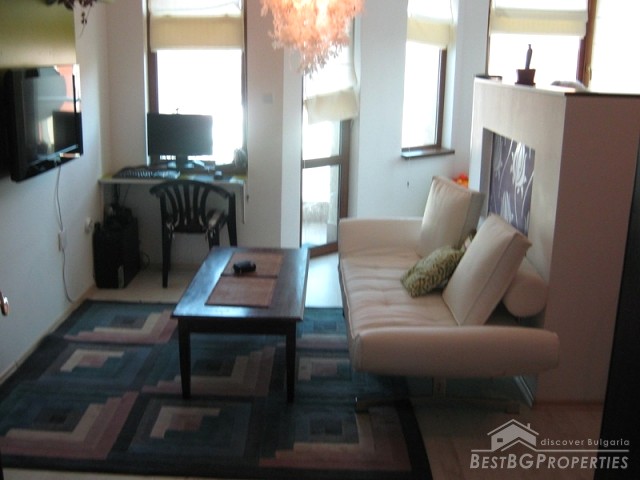 The apartment is one bedroom type and comprises total living area of 46 sq m. The living area is distributed between a living room with kitchen box, bathroom with WC, bedroom and a balcony. The apartment is ready to move in and suits perfectly for permanent living. It has a nice view towards the sea and air-conditioning.