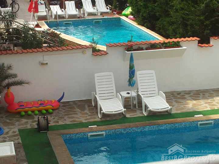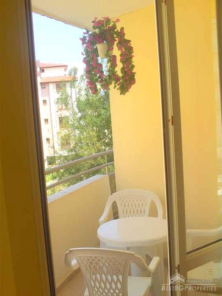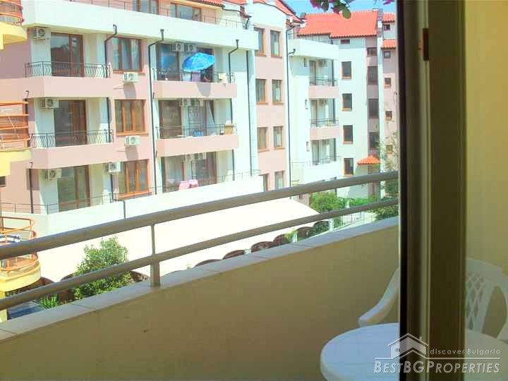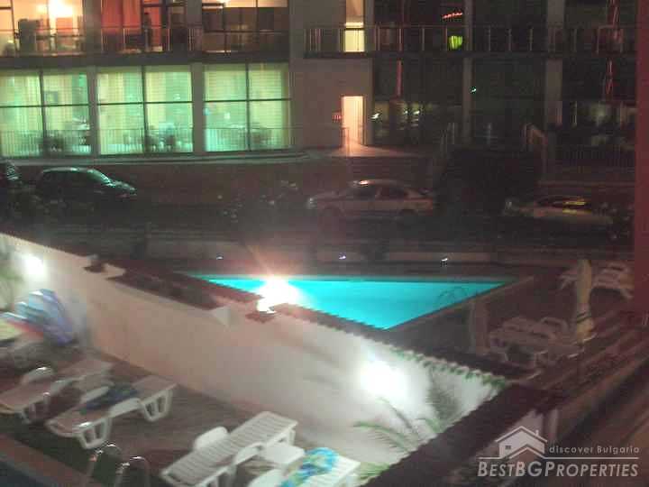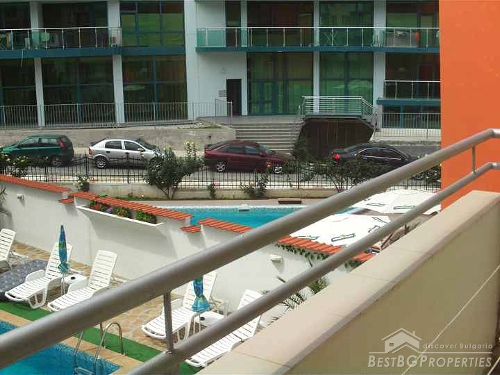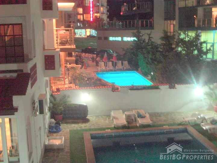 The apartment comprises total living area of 53 sq m. It is on the second floor of the five-floored building. It consists of a living room with kitchen box, lounge, one bedroom, bathroom with WC, and two balconies with splendid views over an open air swimming pool. There also a 4 sq m large storage premise included. The apartment suits perfect for permanent residence. The building has its own parking are and a very convenient location next to a large hotel.