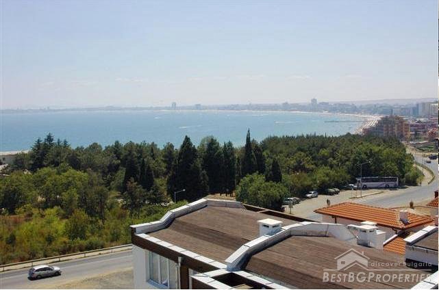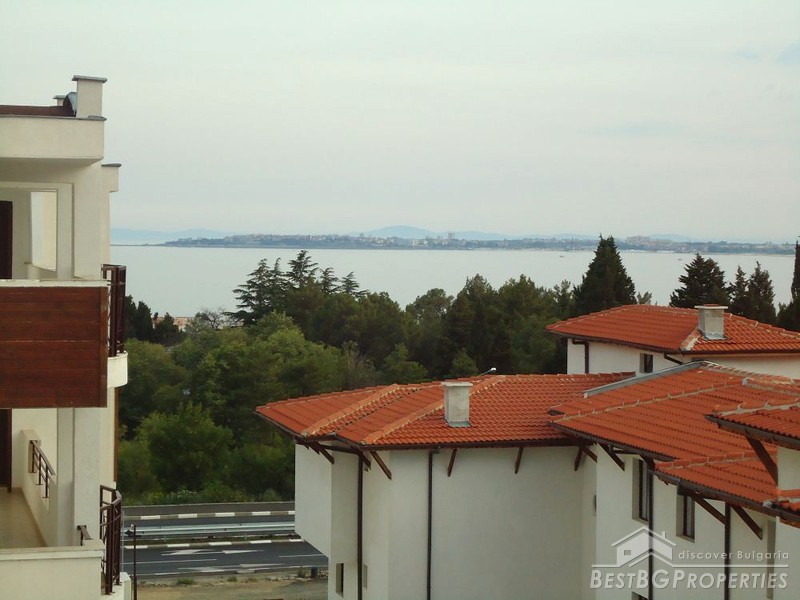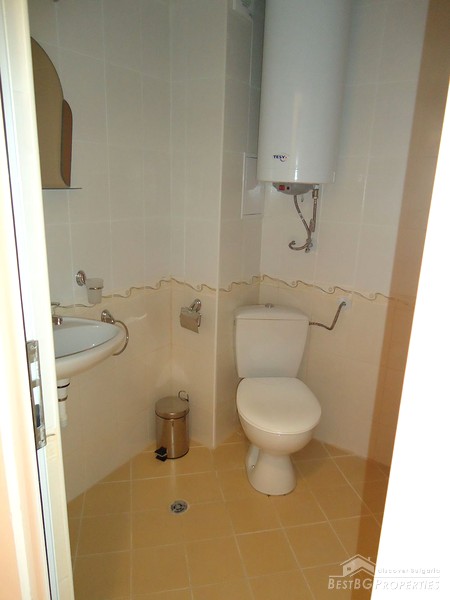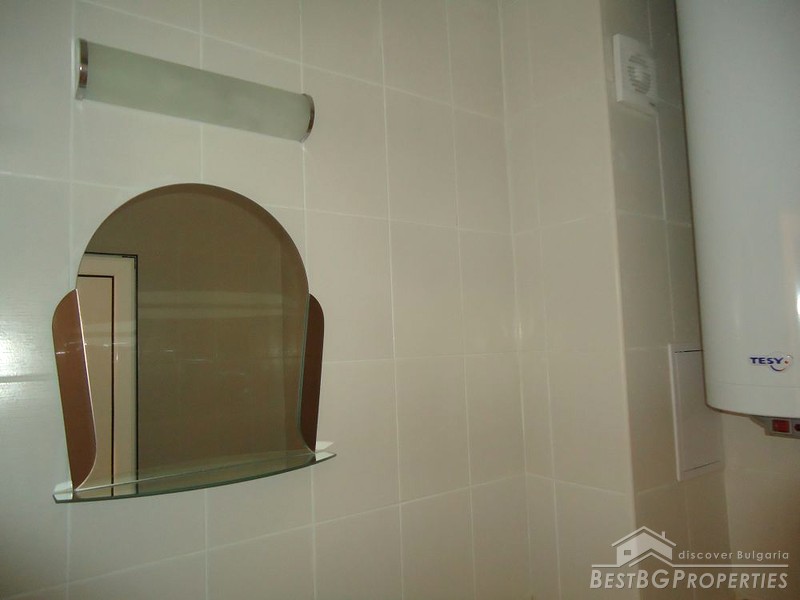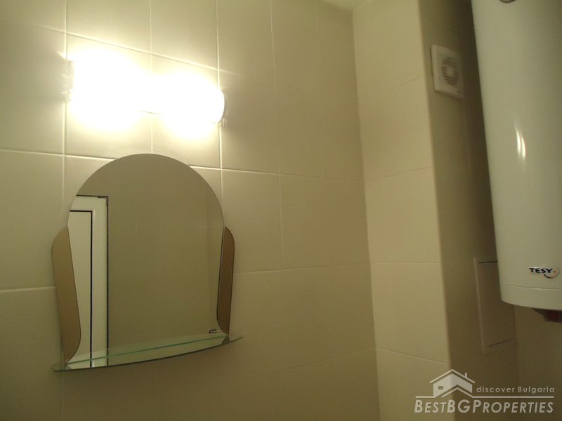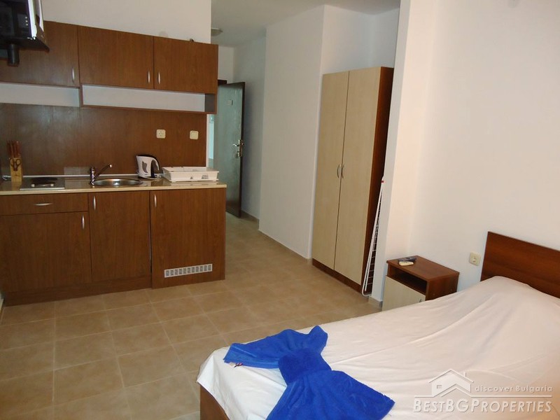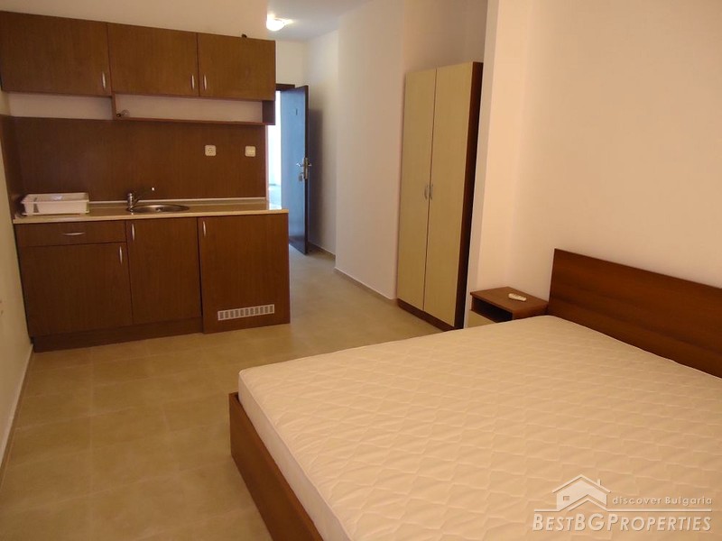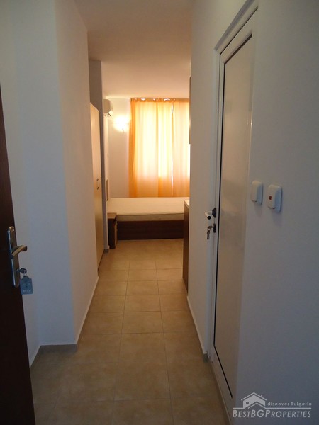 The offered studio is situated on the fourth floor of the building and has total living area of 30.52 sq m including the common parts. The clean living area is 27 sq m. The apartment is for sale fully furnished and equipped with cupboards, hob and extractor, bathroom with bathtub, double bed, table with stools, hangers, wardrobe, bed linen. The studio was given away for rent last year, never has been used previously. It has a side view of the sea. The maintenance fee is 10 euro per sq m.