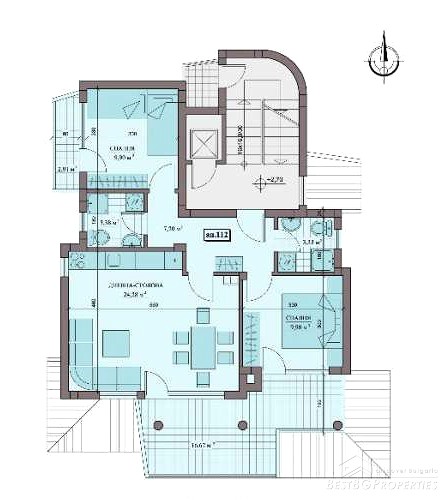 The apartment has 2 bedrooms, two bathrooms, spacious living room with open plan kitchen, hallway and two terraces. The living room is facing south and the bedrooms - south and west. There is a large veranda and a balcony. The total living area is 86 sq m.
