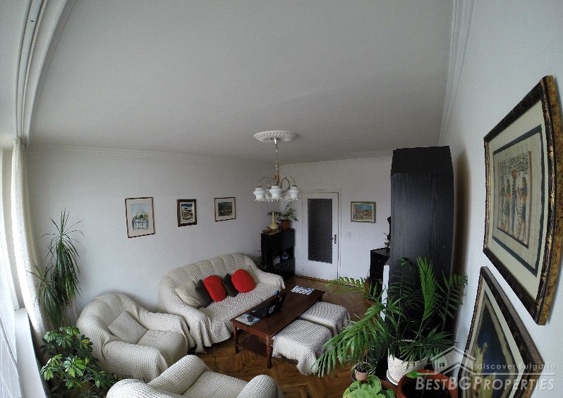 The apartment has total living area of 100 sq m. It is situated on the second floor of the five-storey panel building. It is an inner apartment – very warm and cozy. The living area is distributed between four rooms and a kitchen box. There is also a large balcony with views of the mountain.