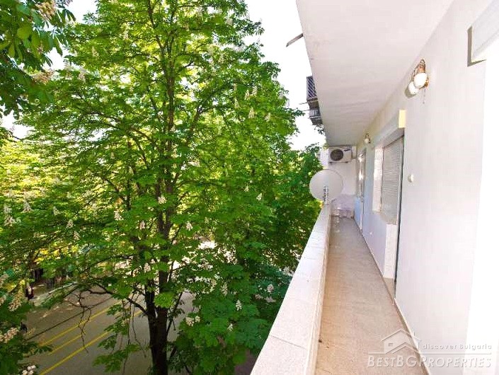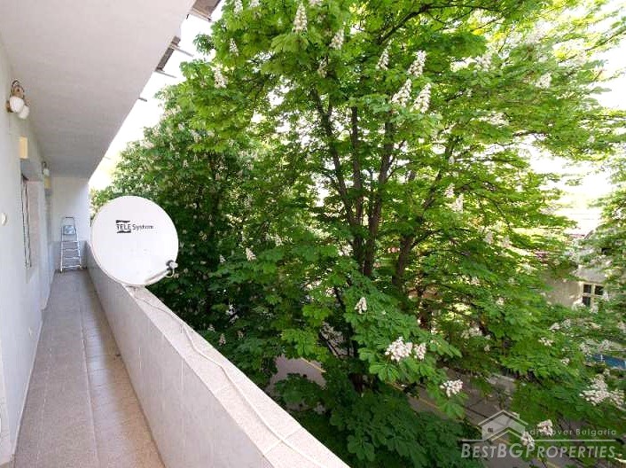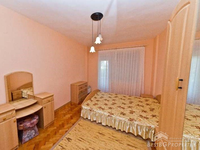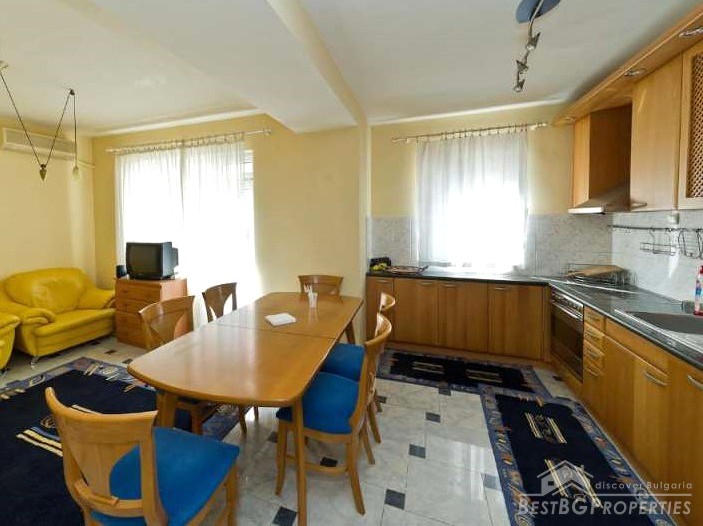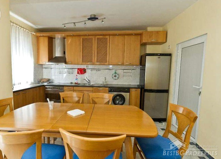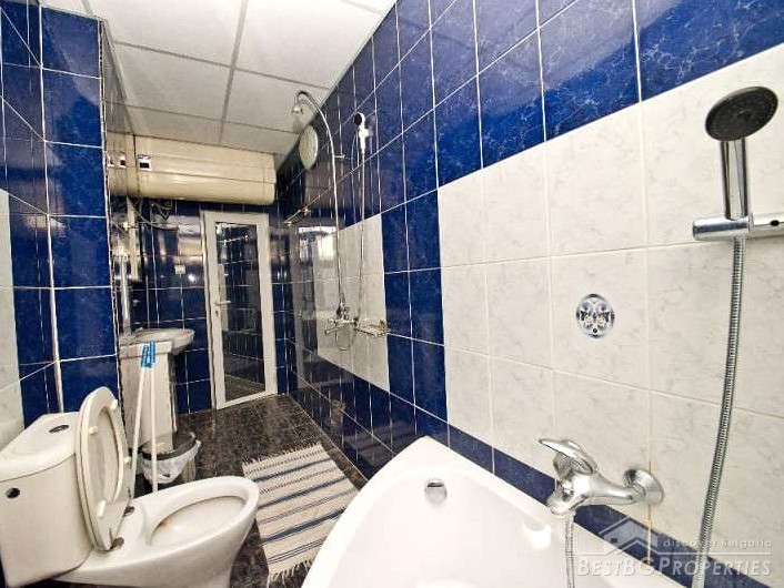 The apartment has an area of 107 sq m + 9% of the common shares. It is located on the main street, meters from the city park, spa hotels, schools, administrative and commercial areas. It consists of three bedrooms, two with bedroom sets, and the third with corner beds. All three have access to a balcony. The floorings are parquet. There is a kitchen with quality fitting - granite countertop, integrated oven, a large dishwasher, dryer, refrigerator, dining table made of solid wood and 6 chairs. In the living room there is a leather sofa and armchairs. Living room and kitchen also have access to a balcony. The floor is granite. Spacious entrance hall leads to a large bathroom with WC and corner bath.