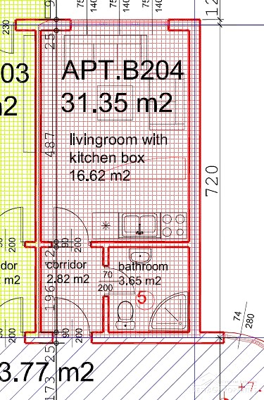 The apartment is designed in line with the latest trends. There are all amenities including satellite television, cable and wireless Internet connection, air-conditioning, fully finished and equipped bathroom. The apartment comprises clean living area of 27.4 sq m and total living area of 31.35 sq m. The living area is distributed between a living room with kitchen box, corridor, and a bathroom with WC. The studio is set on the second residential floor out of five. It has tiled floor, latex painted walls and ceilings, installed PVC window joinery.