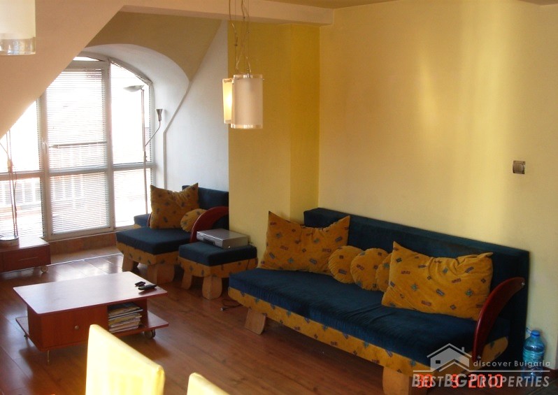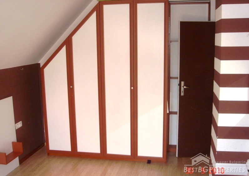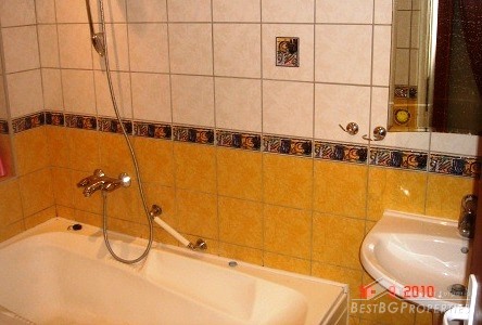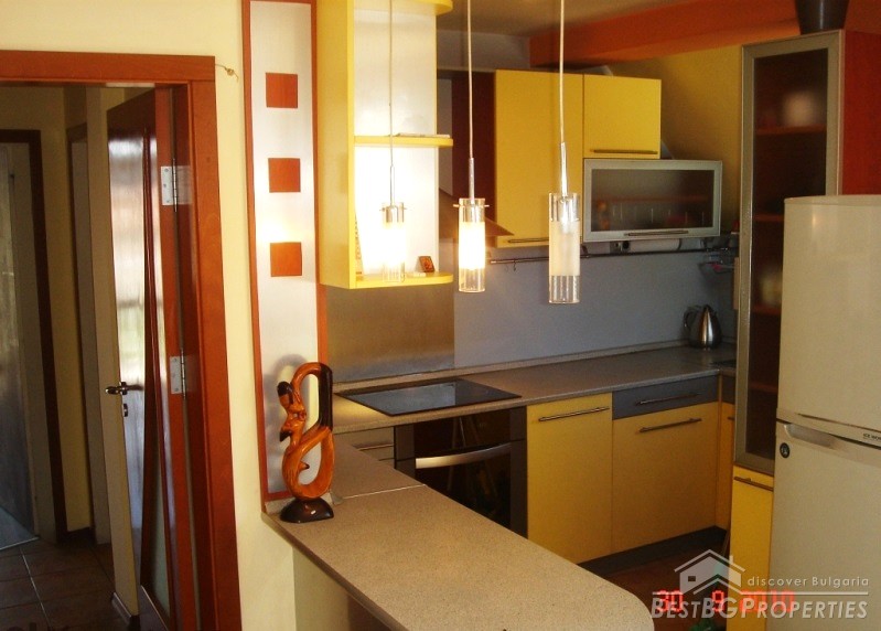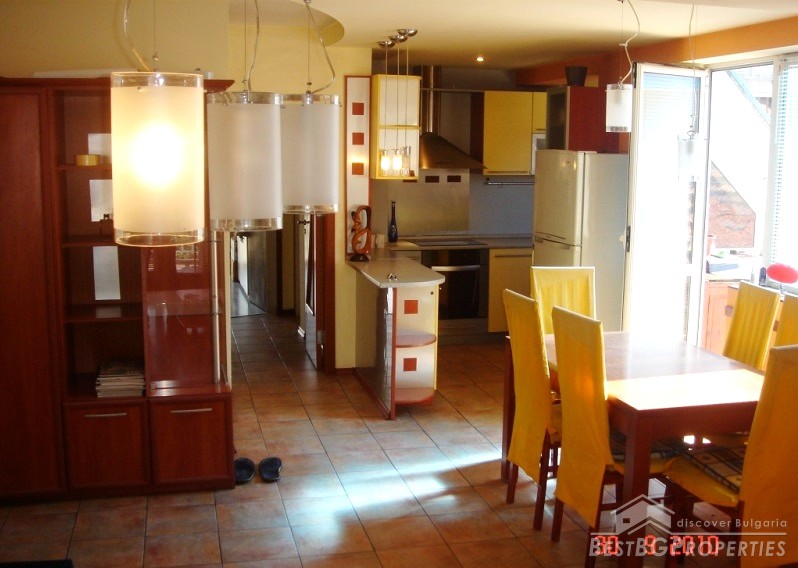 The apartment is one-bedroom type and has total living area of 100 sq m. It is sold fully furnished and equipped. The living area is distributed between a living room with kitchen, one bedroom, children’s room and three balconies. All of the equipment is luxury.Fitted electrical appliances - Gorenje oven, ceramic hob, dishwasher, and extractor fan with remote. The children’s room is furnished with cupboards and a closet. The bathroom has a bath tub. The living room is equipped with dining table, soft furniture, cabinets with glass doors. The window joinery is aluminum + K glass everywhere. The price also includes a basement premise.