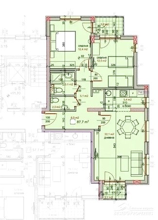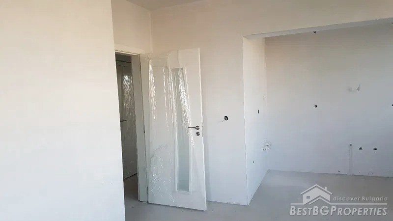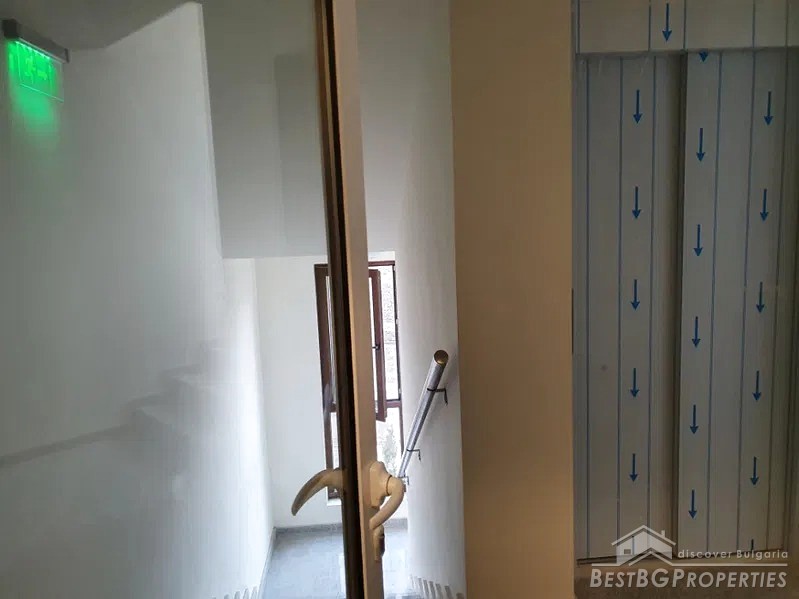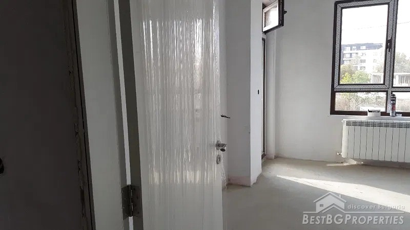 The apartment is finished to meet the Bulgarian standards – plastering and putty. It is sold with mounted front door, interior doors, aluminum radiators, double glazed windows, 10 cm exterior insulation. The heating is with gas.