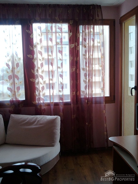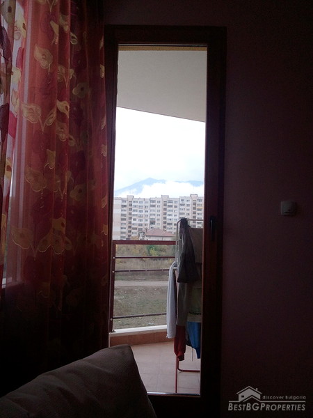 The apartment is set on the second residential floor and has exposure to south and east. It consists of a cozy living room with kitchen box and dining. The kitchen is overlooking the living room and is equipped with cup boards, fitted appliances, invertor air conditioner. The living room comprises a balcony with panoramic views over the mountain and the neighborhood. The bedroom is bright with access to a balcony, furnished. The children's room has its own balcony, sofa, table and desk. There are two sanitary premises. The bathroom is fully equipped, mounted boiler.