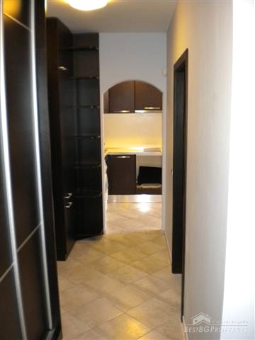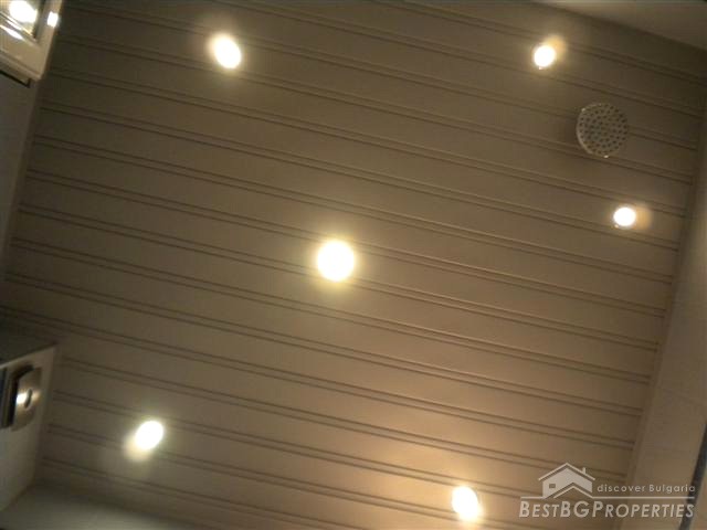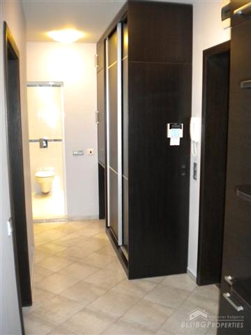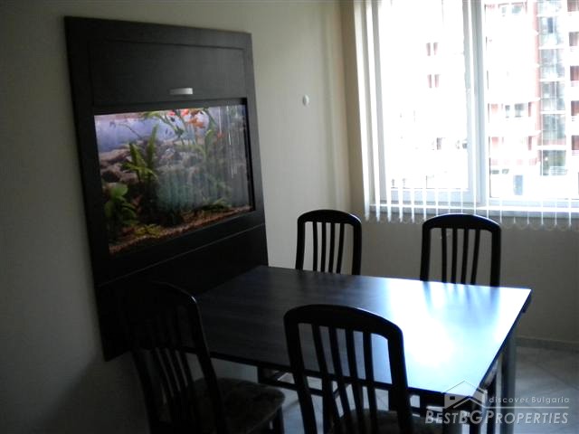 The building is part of the active luxury residential construction which is in progress in this area. The apartment is one bedroom type and comprises total living area of 78 sq m. The living area is distributed between one bedroom, bathroom with WC, living room with kitchen box and a corridor. The apartment is for sale luxury furnished and equipped. It even has a large aquarium in the dining area. The furniture is modern and high quality. The apartment is situated on the second floor of the building and has southern exposure. In addition there is a basement - 4 sq m in size.