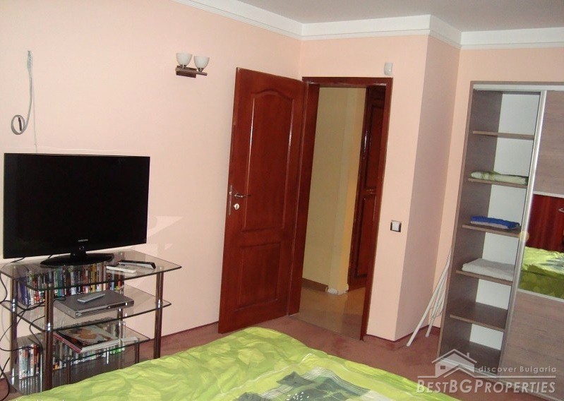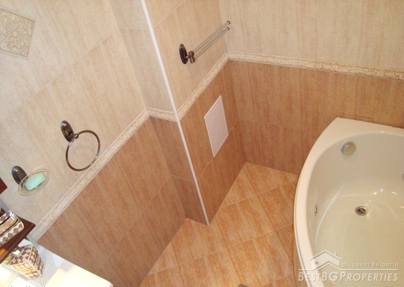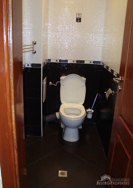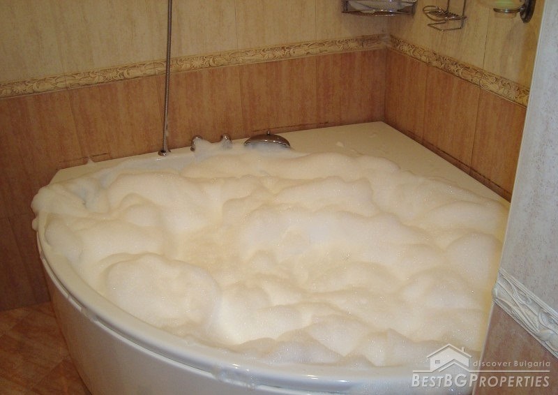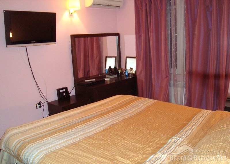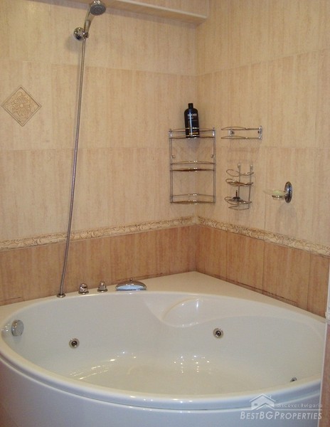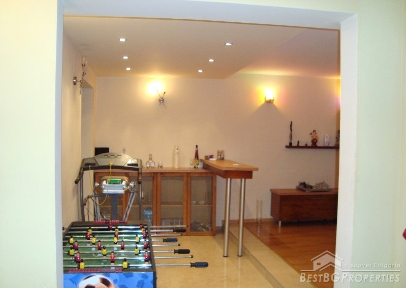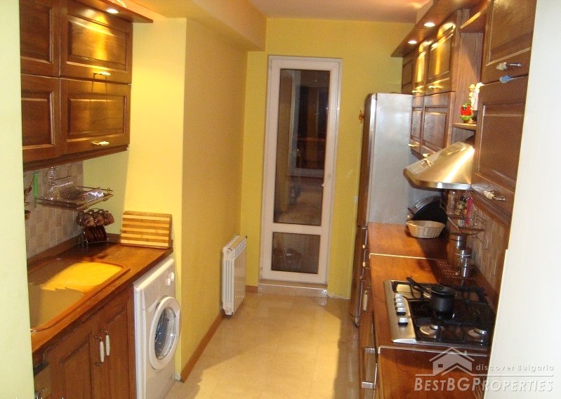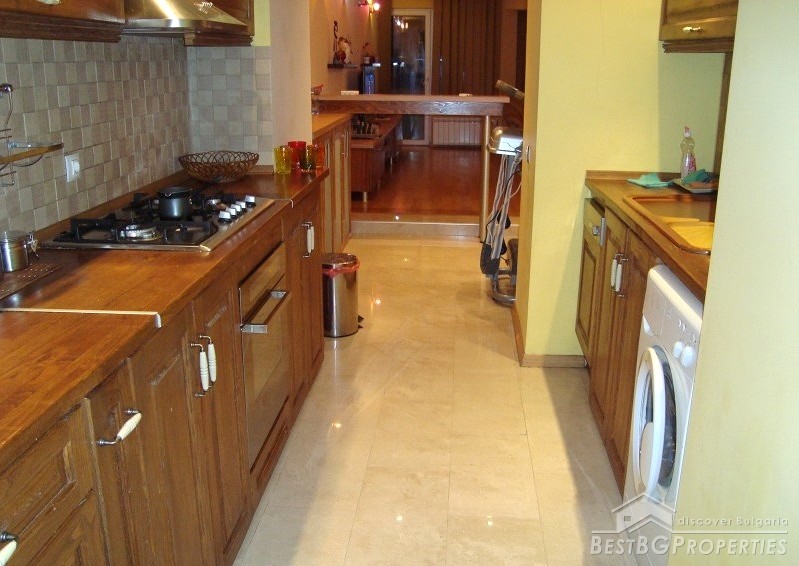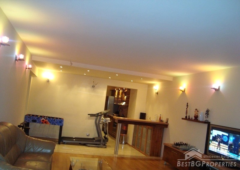 The apartment is gasified, with radiators everywhere, with air conditioners fujitsu-siemens inverter in every premise. It is luxuriously finished with Italian tiles, have 42 cm plasma TVs in every room, custom kitchen with all appliances - Ariston (includes fridge, dishwasher, ceramic hob on electricity and gas, oven, etc.). There is custom bedroom furniture - beds 2*2.20 m, bathroom with Jacuzzi, living room with parquet (cherry) also with custom furniture (cherry), 2 balconies overlooking Vitosha Mountain. The total living area of the apartment is 115 sq m. It is situated on the first floor of a six floored brick residential building. The price also includes a basement, parking space, treadmill, football game and much more.
