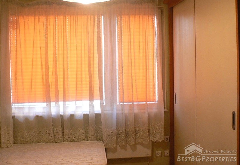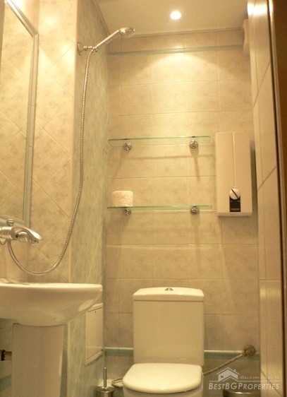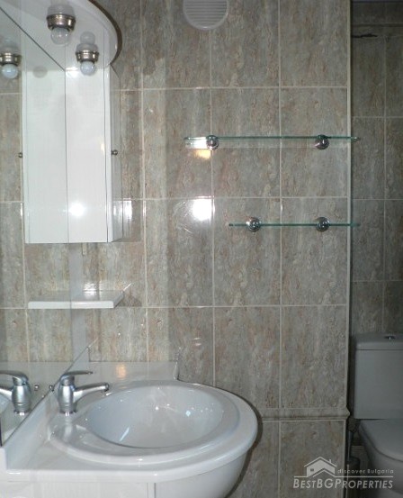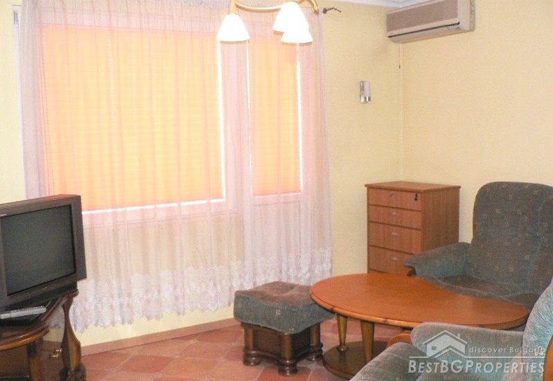 The furniture includes sofa and an armchair, coffee table, TV cabinet, two large wardrobes in the hallway and bedroom, etc. The heating is via electricity – convector radiators and air conditioning. There is new washing machine and refrigerator, Bosch dishwasher, four ceramic hobs, oven, extractor. The apartment has new luxury terracotta floors, faience bathroom, standard boiler and instantaneous water heaters.