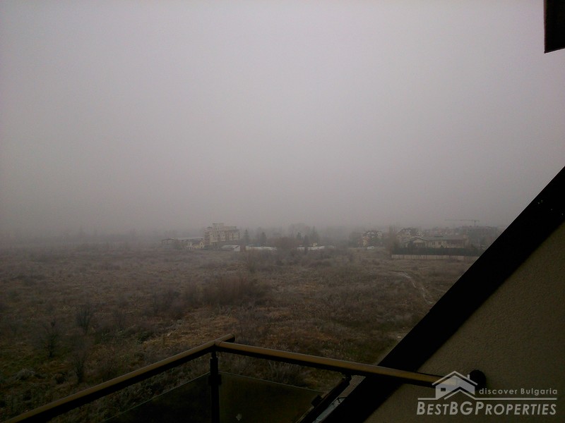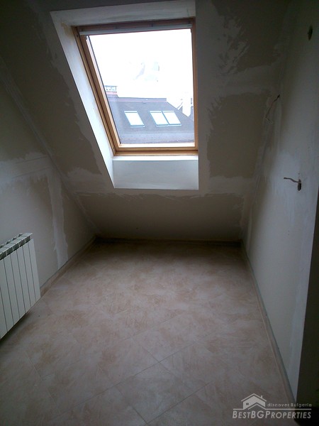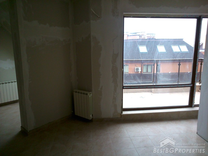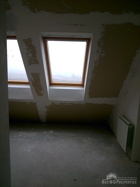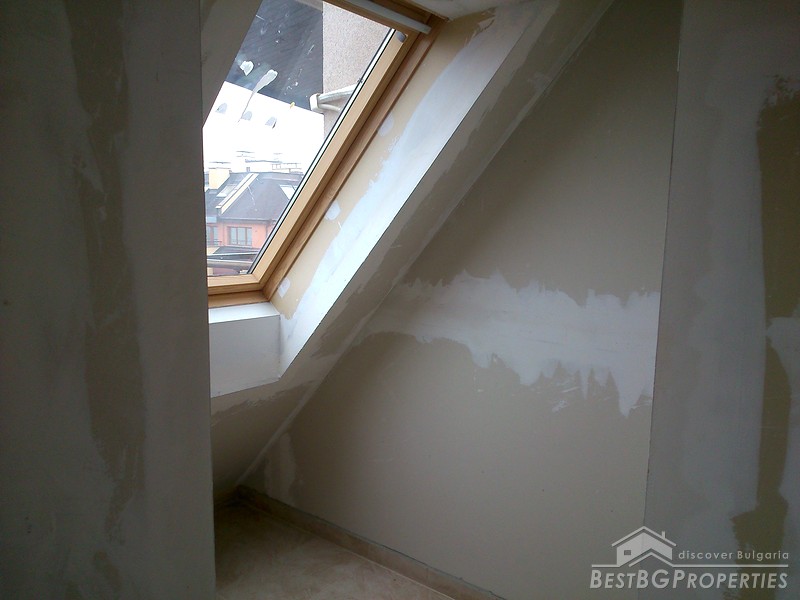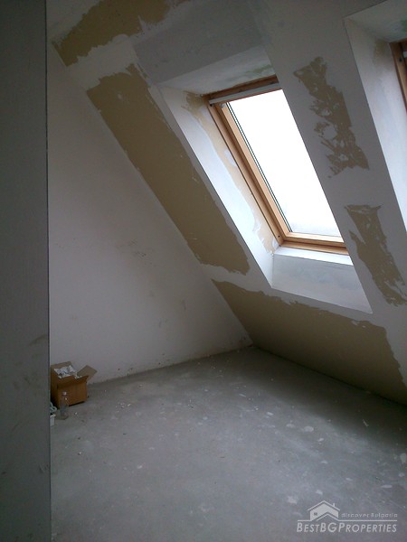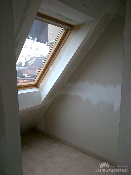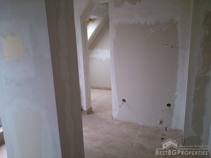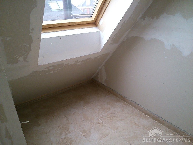 The living area is distributed between two bedrooms with private bathrooms, spacious living room with kitchenette and a balcony. One of the bedrooms also has a balcony. Both the terraces are with area of 5 square meters. The apartment is located on the last – fourth floor. The ceilings are slopped in only one of the bedrooms. The apartment is gasified. The finishing is according the Bulgarian standard – on plastering and putty. There is very good isolation.