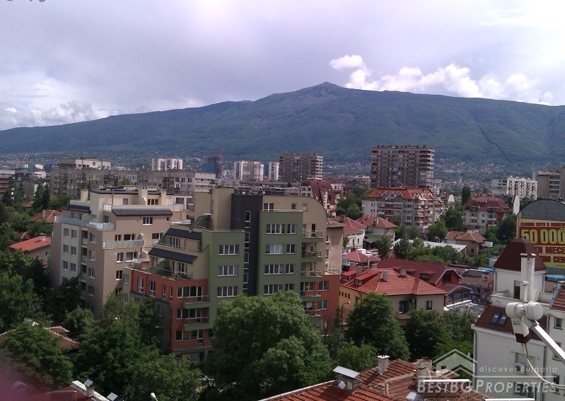 The total living area is 72 sq m. The apartment is on the eight floor of a nine storey new building completed in 2008. The living area is distributed between a living room with kitchen box, one bedroom, bathroom with WC, and two balconies with amazing views towards Vitosha Mountain. The price also includes a storage premise.