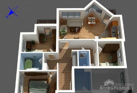 The apartment has total living area of 110 sq m and consists of a kitchen, dining and living together in one large room, three bedrooms (master bedroom plus two children's rooms), bathroom and a separate toilet. The clean area is 98 sq m.