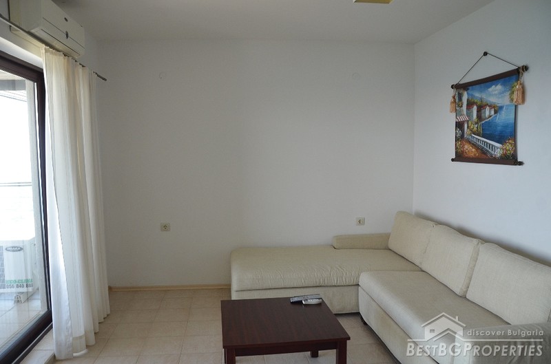 The apartment is fully furnished and equipped. It is located on the second residential floor. The distribution inside the following - entrance hall, bathroom with shower and toilet, separate bedroom, spacious living room with kitchen box. The living room opens onto a terrace with wonderful view of the pool and the sea. The price includes air conditioning in the living room and in the bedroom. The total living area is 55 sq m.