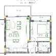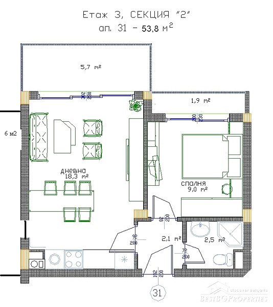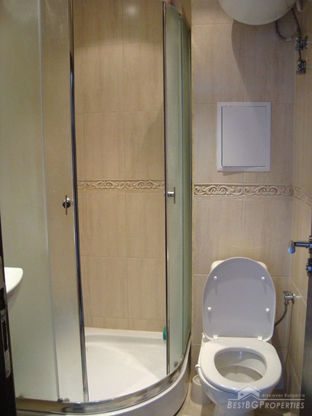 The apartment comprises total living area of 55 sq m, and has north-west exposure. It is on the third floor of the building and consists of 3 balconies (2 large ones and 1 small), living room with kitchen box, one bedroom, lounge and a bathroom with WC. The apartment is fully equipped with furniture and household appliances. In particular there is a washing machine, stove, oven, fridge, plasma 32 inch TV. Each room is equipped with air conditioning. The price also includes a basement premise which can be used as storage space (7m2).
