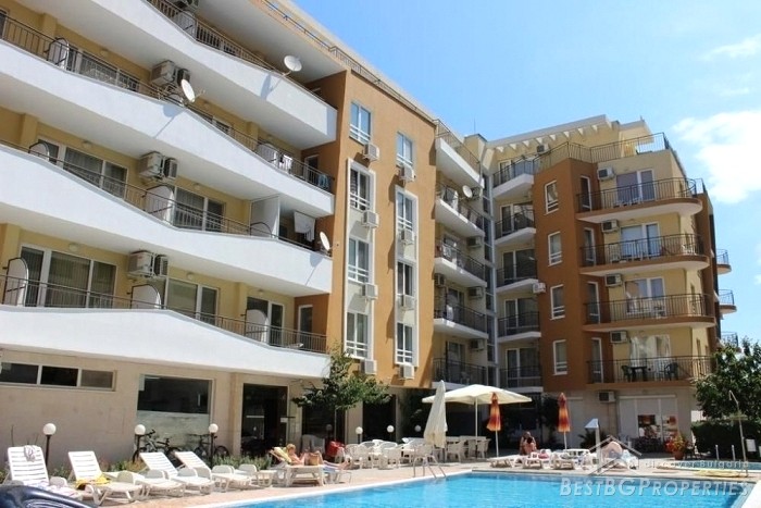 The apartment is located on the fourth floor of the complex, in the southern part of Sunny Beach, in a 5-minute walk to the town of Nessebar. It is also 50 m away from the beaches "Oasis", "Bedroom", 100 m from "Cacao Beach", close to the stops of the public transport, etc. The owners and guests of the complex can use large and small swimming pools for adults and children, a popular restaurant, shops and a hairdresser's.