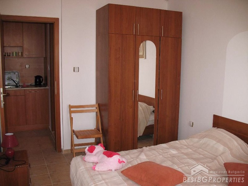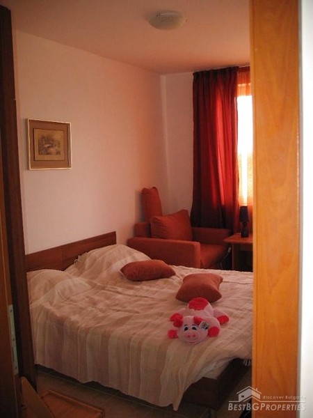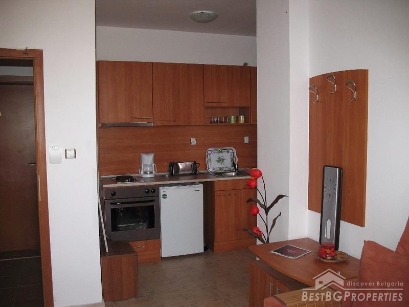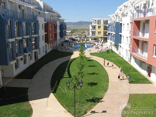 The complex is only 900 meters from the beautiful beach in Sunny Beach. The regional center of Burgas and Sarafovo International Airport are just in a 20-minute drive. The complex has parking spaces for the convenience of the owners. There is an outside swimming pool, a bar, a children's playground, a restaurant, shops and beautiful green areas. Nearby there are grocery stores.