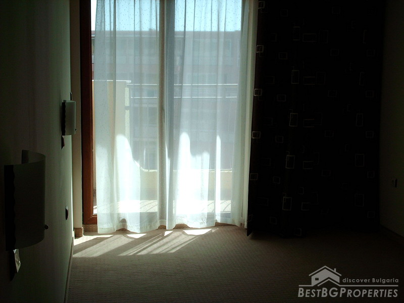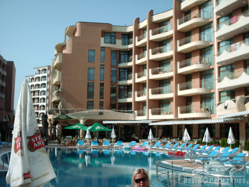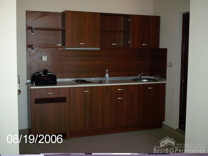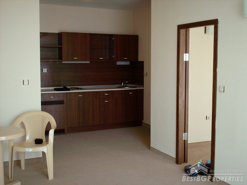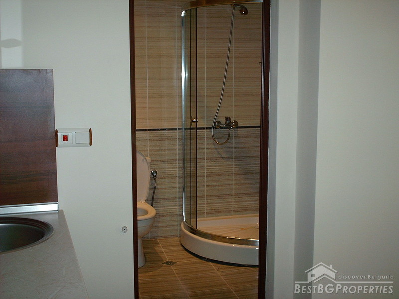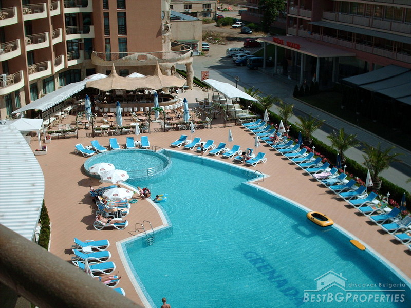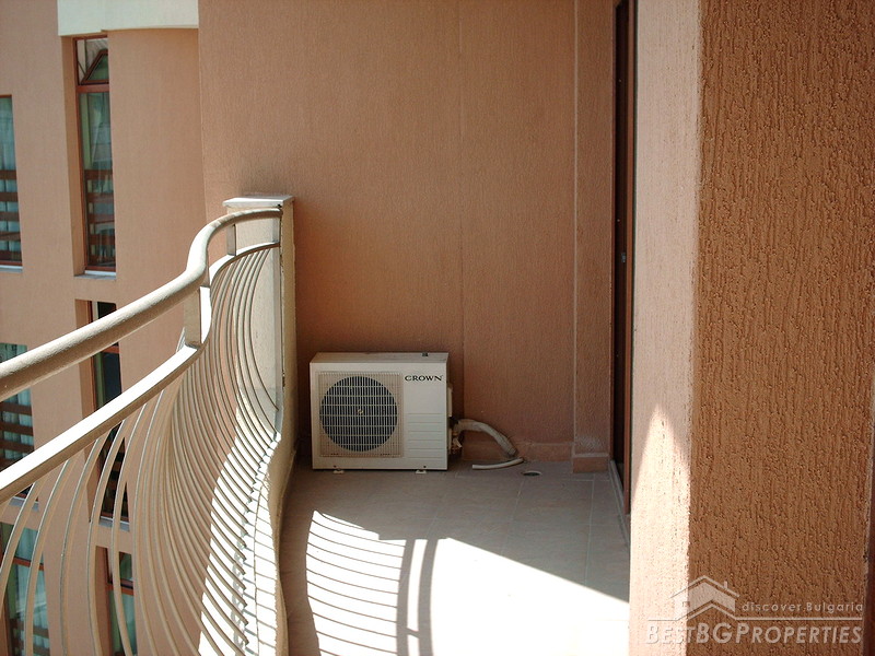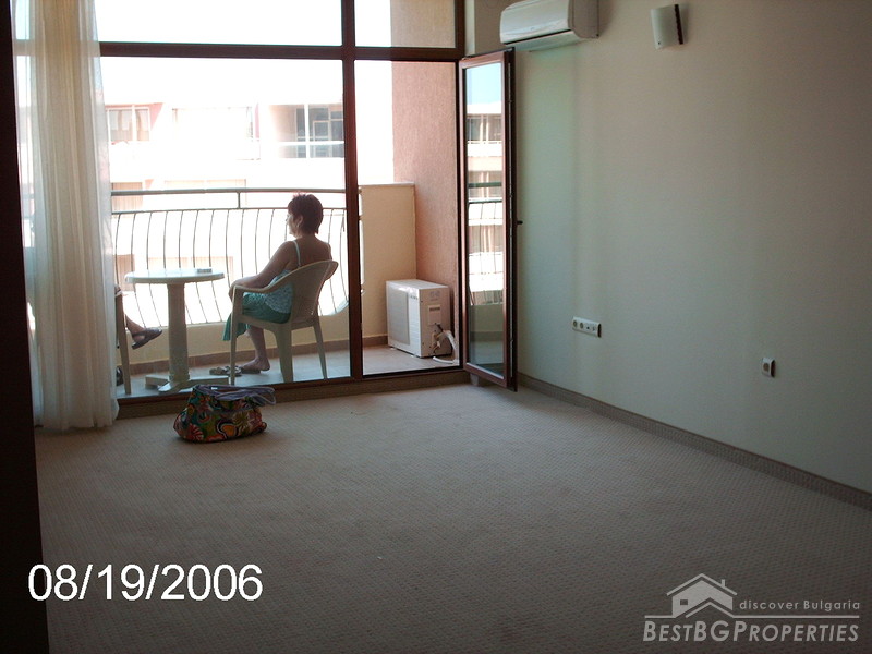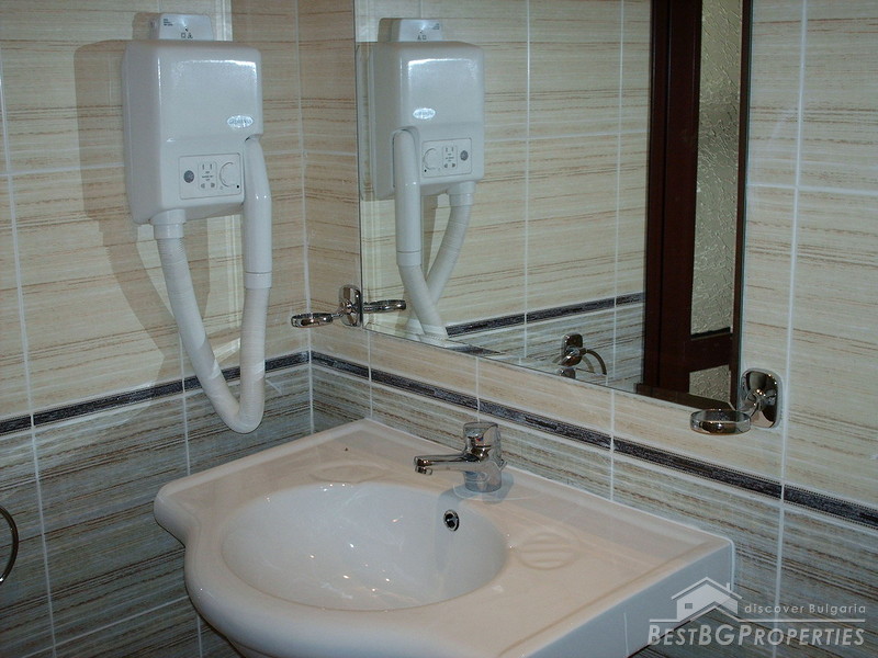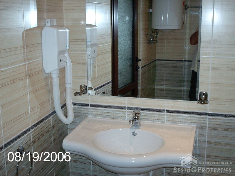 The offer is of a 1 bedroom apartment with total living area os 62.8 sq m. It is on the fifth floor of this lovely development right by the beach; close to the old town of Nessebar. The beach is 30 seconds away; there is a road train service which can get you in the old town of Nessebar or the resort centre within 5 minutes. There are plenty of bars and restaurants nearby however the position is perfect as it does not get noisy at night, leaving you with the choice for a quieter evening if you wish. The hotel facilities are ample and it is a nice environment to be in. The apartment faces the pool and there are partial sea views, balcony access from both the living room and bedroom. It comes with a fully fitted kitchen including fridge, hob and extractor fan sink unit and plenty of storage space. The apartment has air conditioning and is finished to a high standard with ample power points and lighting. The shower room has a classy finish and includes a wall mounted hairdryer and shaver point.