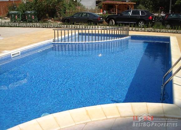 The total living area of the apartment is 65 sq m. It is one bedroom type. The building has its own private pool.