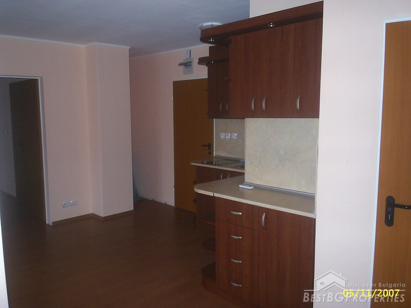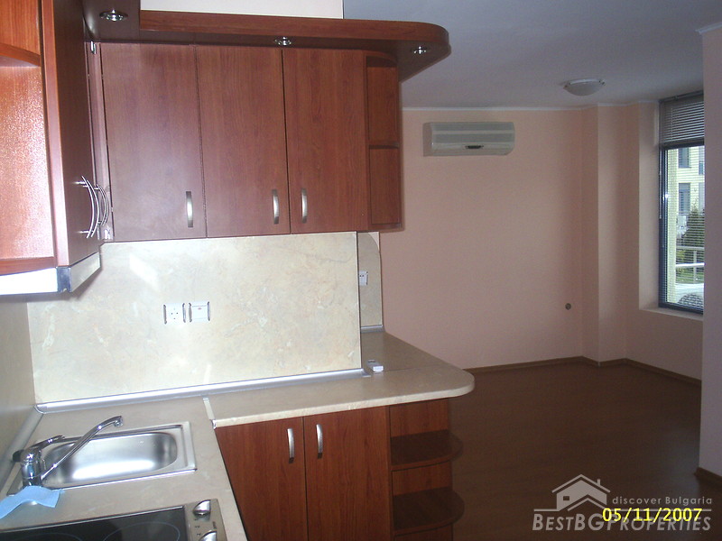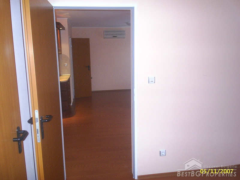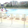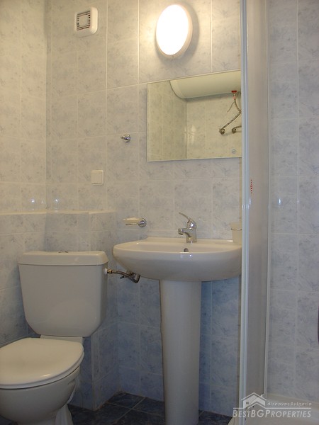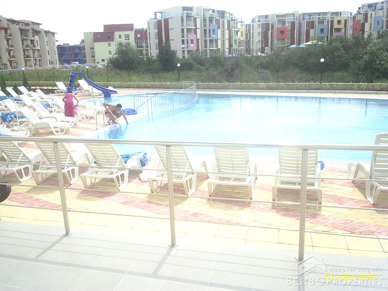 This is an apartment for sale located in the center of Sunny Beach resort. The apartment is one bedroom type. It consists of two rooms and two bathrooms. It is fully finished according to the highest standards of construction - laminated floorings, latex painted walls and ceilings, all switches and plugs are installed, PVC window joinery. There is water and electricity provided. The apartment is for sale with equipped kitchen, bathrooms and WCs. The kitchen is fully fitted and includes electrical appliances, cup boards and a sink. There is also an air conditioner. The apartment is located on the first floor of a residential complex, just 100 meters from the beach and the sea. The property is 84 sq m large. From the windows open nice view towards the pool.