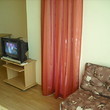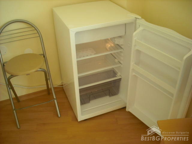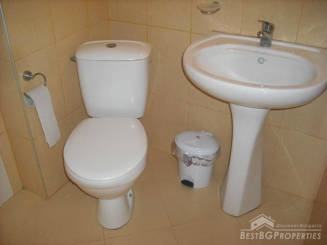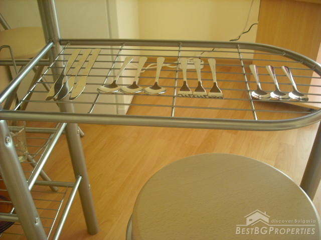 The apartment is a studio type and comprises total living area of 38.16 sq m. The living area is distributed between a spacious living room with kitchen box, corridor, bathroom with WC and a balcony. The apartment is for sale fully furnished and equipped with everything necessary. It is finished with best quality materials according to the highest requirements of construction. The walls and ceilings are painted with high quality latex paint, the floorings are with laminate and terracotta, the bathroom and WC are finished with terracotta and faience. There is water and electricity provided, also cable TV, telephone, air conditioning.