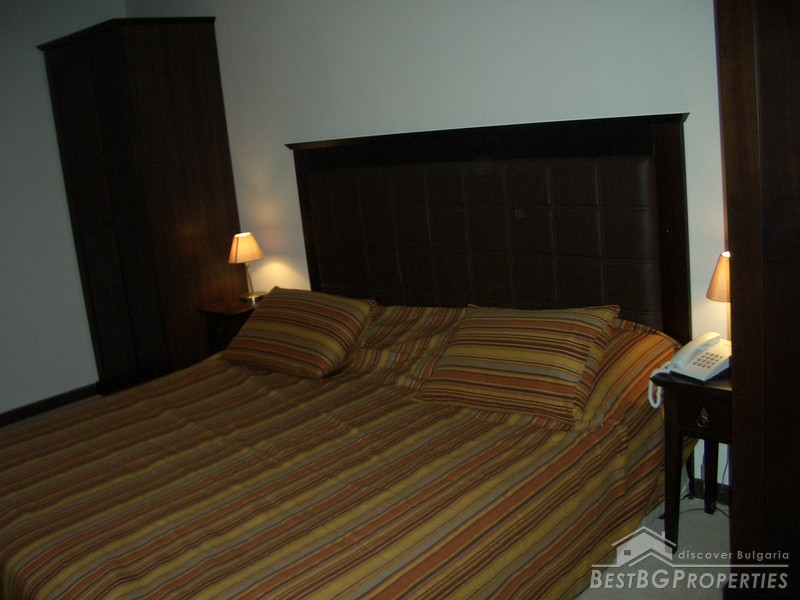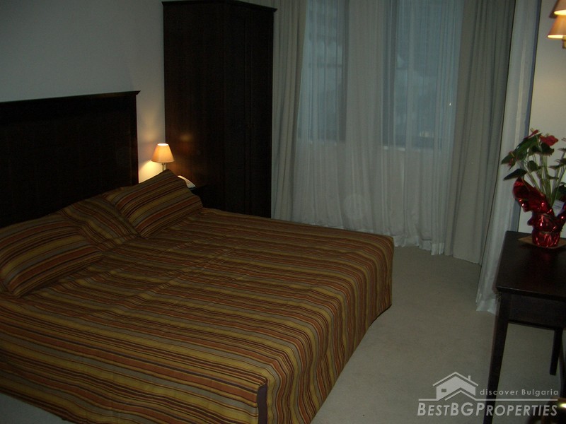 The apartment which is for sale is a one bedroom type of apartment. It is situated on the third floor of the complex and comprises total living area of 80 sq m. The living area is distributed between a lounge, a living room with open plan kitchen, one bedroom, a bathroom with WC and a balcony with awesome view towards the inner pool. The apartment is for sale fully finished and fully furnished. The furniture is high quality and very stylish. It also includes a fully fitted kitchen with all electrical appliances.