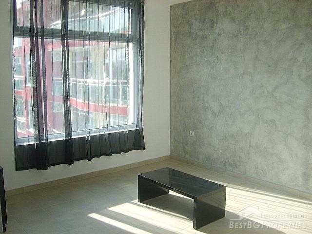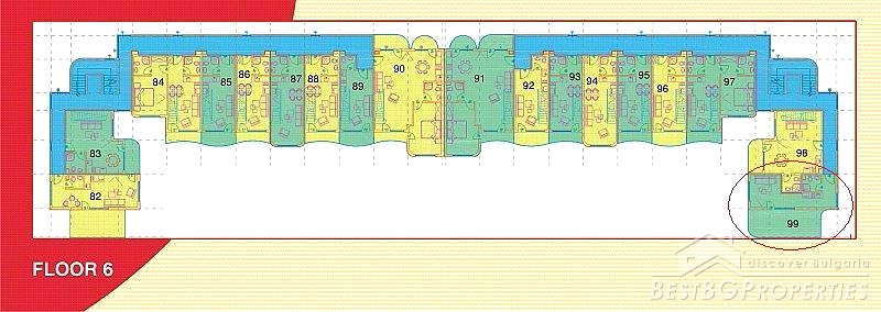The apartment which is for sale is a studio type and it comprises total living area of 56.44 sq m. It is on the sixth floor of the building and it has amazing view over the swimming pool. The apartment is for sale partly furnished, ready to move and finished with: