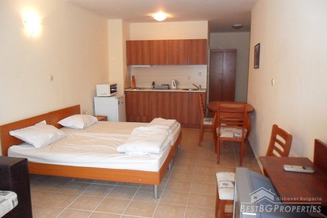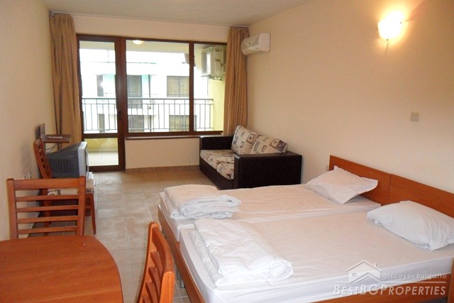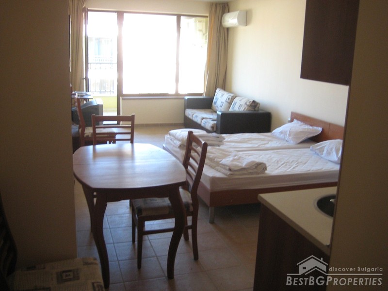 This is a luxury studio apartment for sale located in a three star apartment complex in the seaside resort of Sunny Beach. It is studio number B28a and is situated on the sixth floor. Its total area is 44.01 Square meters, with a built up area of 39.14 sq. m together with balcony 4.87sq m.