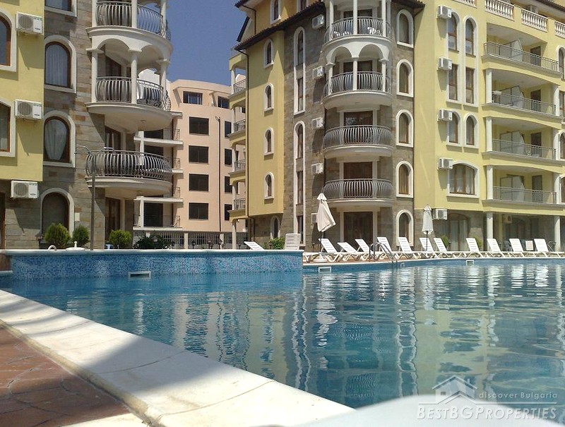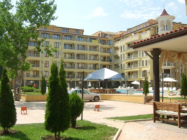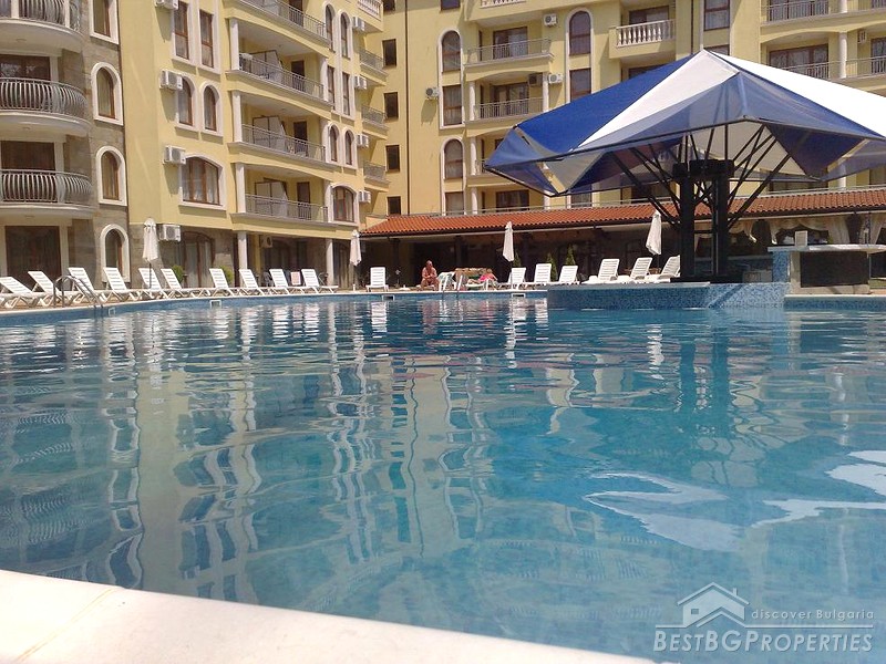 The complex is located in the central part of Sunny Beach Resort and consists of two mirror-imaged fancy architecture buildings situated around a swimming pool. There are 143 apartments in the complex, between 60 and 140 square meters, 6 studio apartments as well as shopping facilities, restaurant and cafe. The resort complex is equipped with swimming pool, pool bar, lifts in each entrance, parking lot, 24 hrs security and maintenance, private access, green areas. It combines the convenience of central location with the peace and quiet of a private holiday.