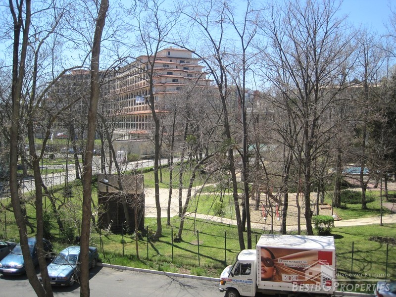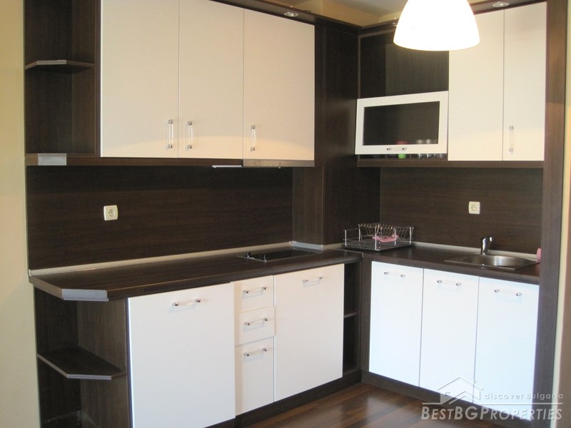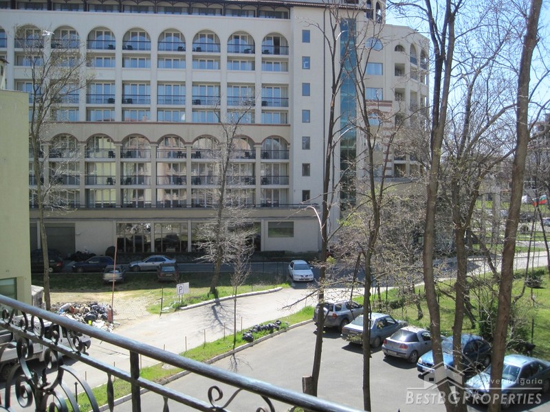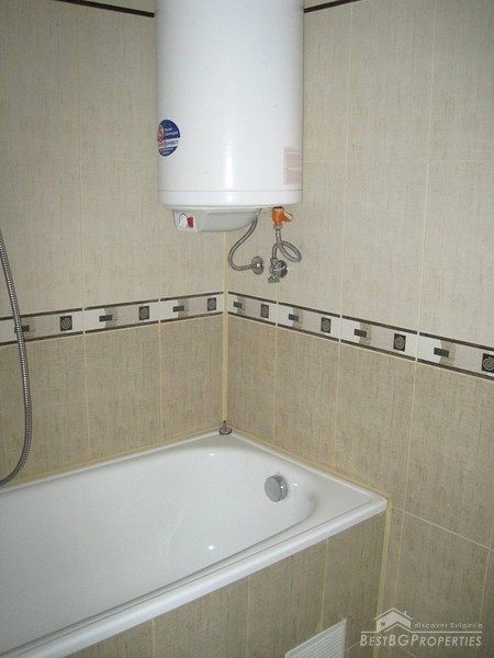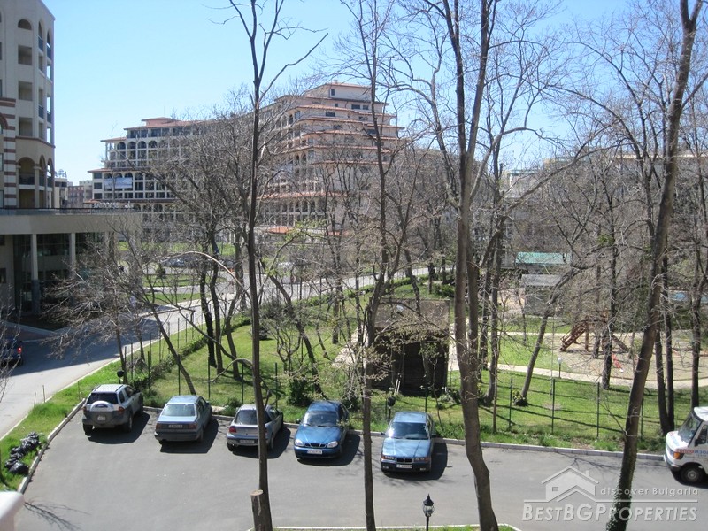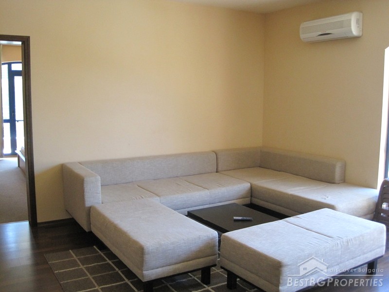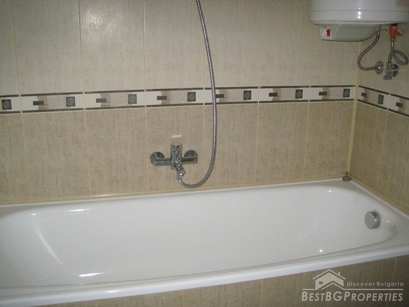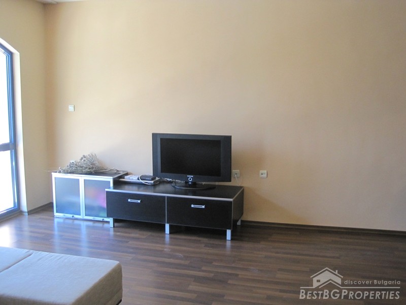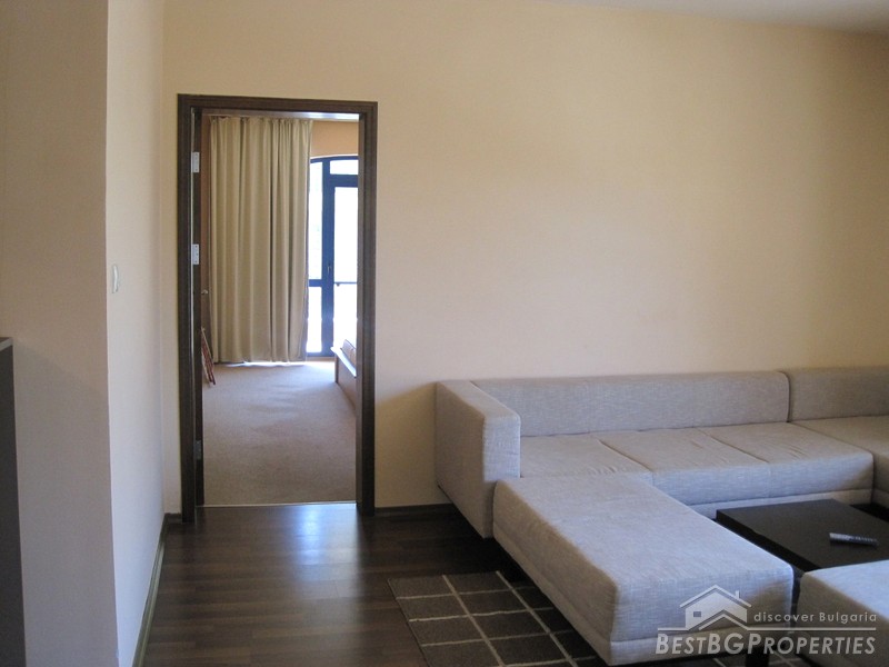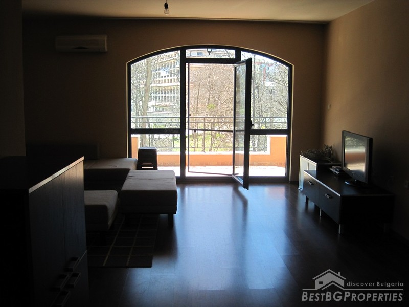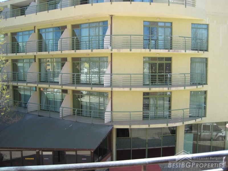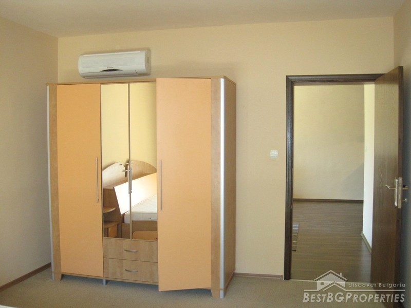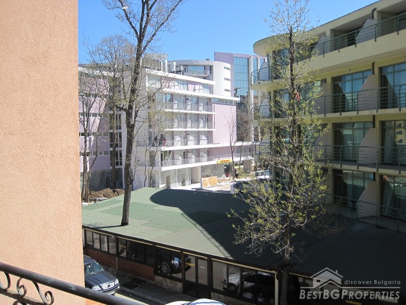 The apartment is situated on the third floor of the building and comprises total living area of 87.29 sq m including the shared parts. The clean living area is 75.43 sq m. The apartment is situated in a newly built apartment complex with all amenities and 600 euro annual tax for maintenance. It is a new hotel complex, built in the very center of the marvelous sea resort Sunny Beach. Situated only 50 m from the beach, the complex offers this comfortable and modern apartment with completely furnished living room and bedroom:
